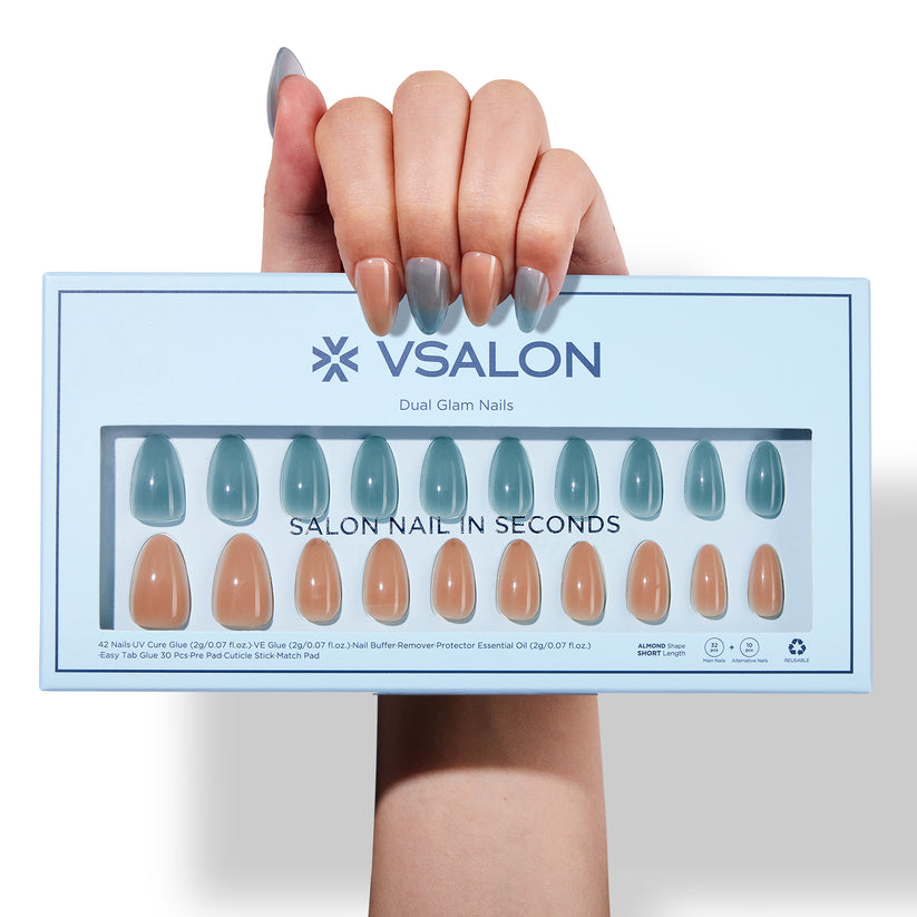 4. عبوة بديلة من أظافر اللوز القصيرة المزدوجة القابلة للضغط - لون كريمي سادة بلمسة نهائية زرقاء وبنية