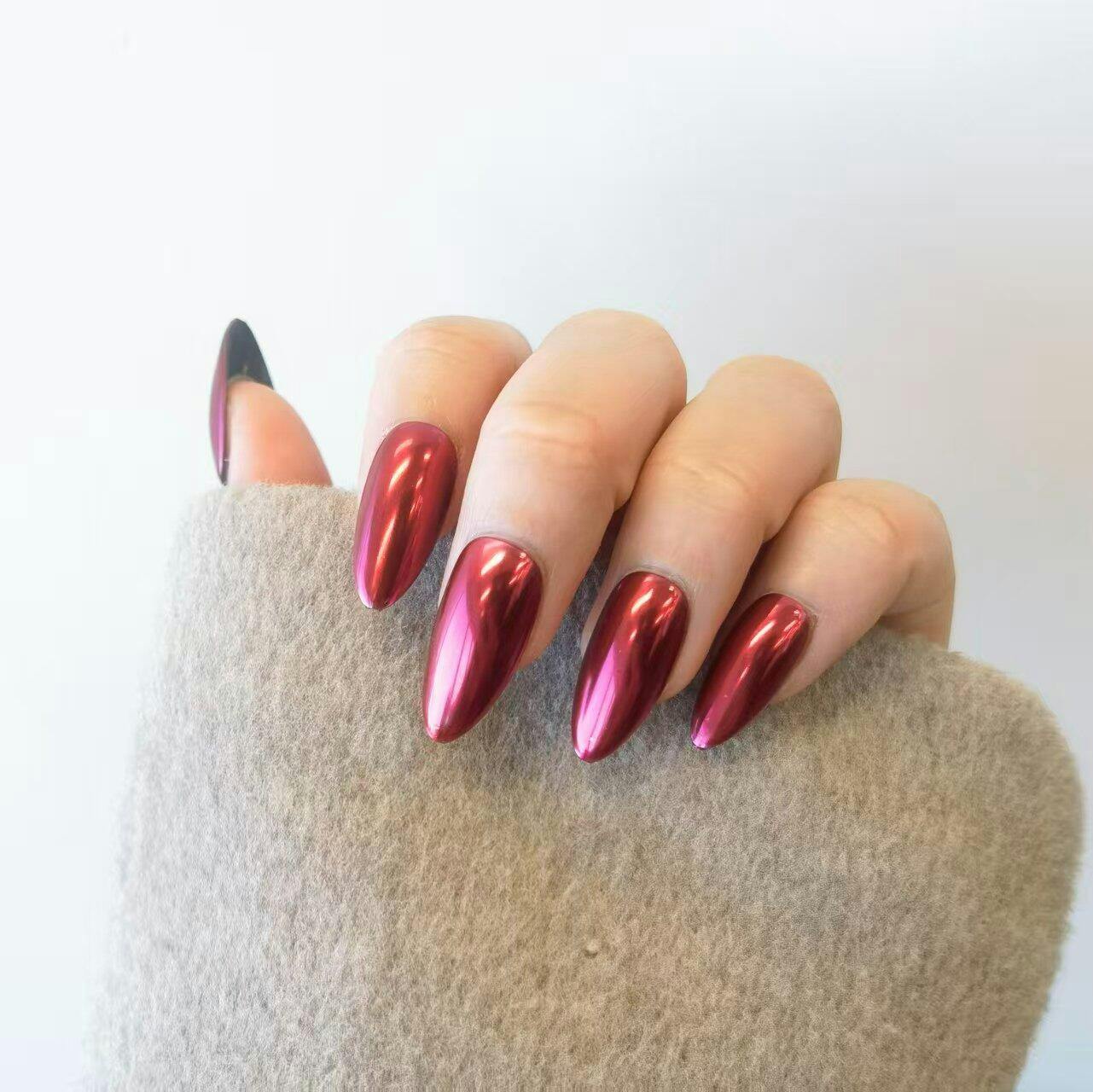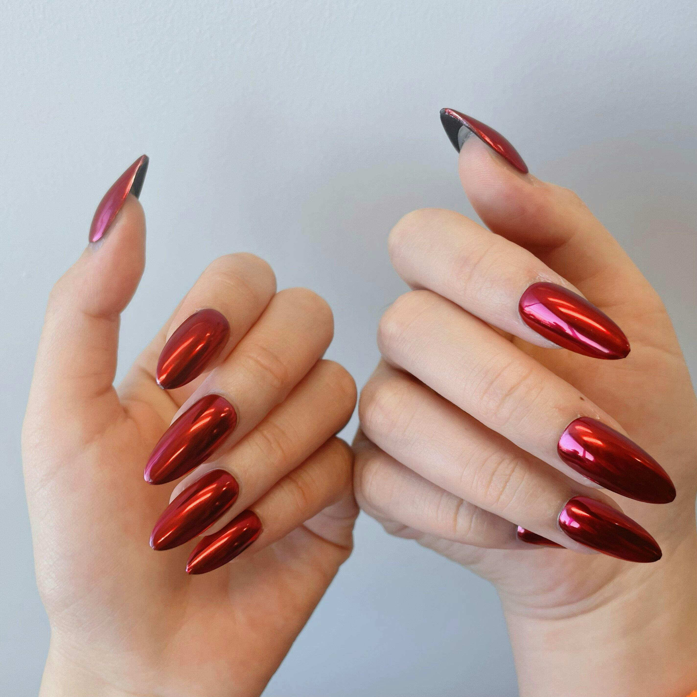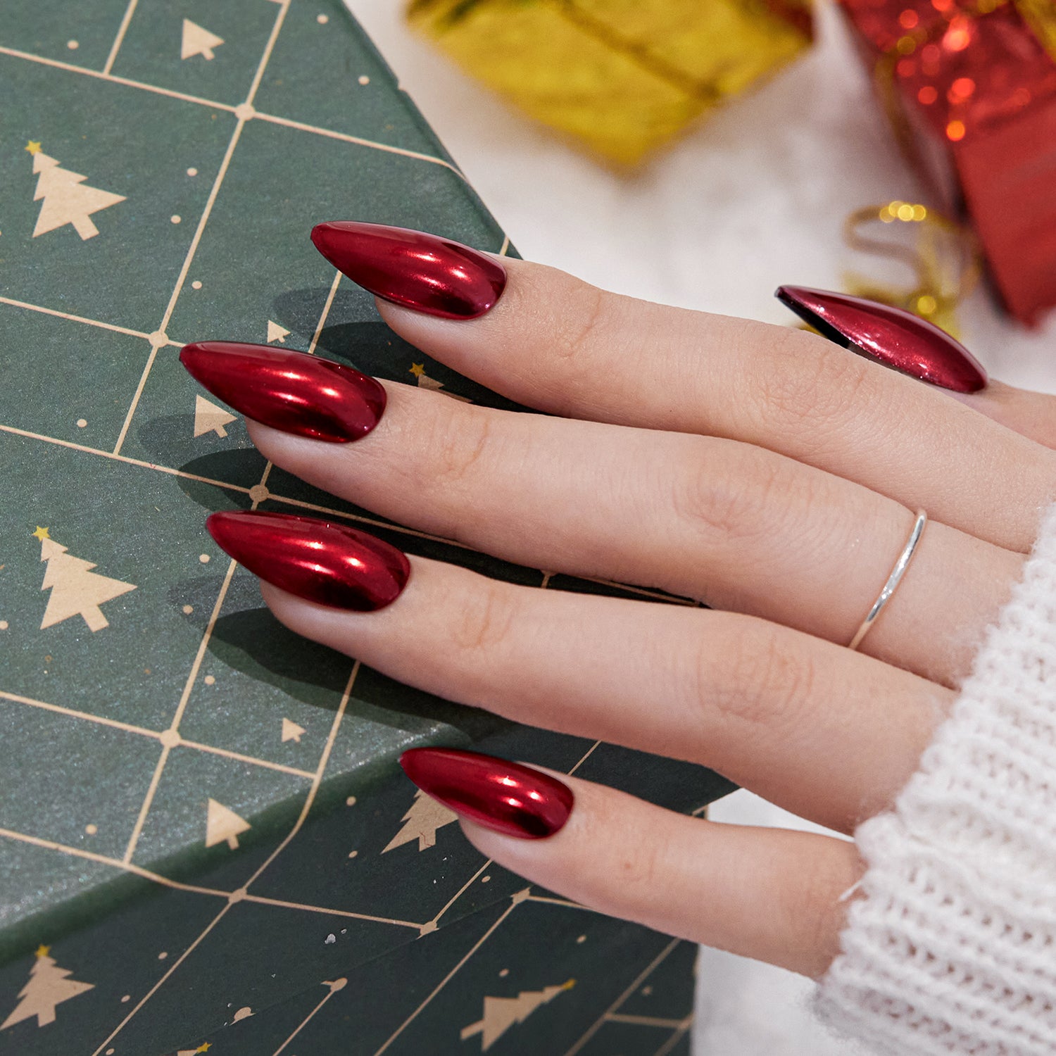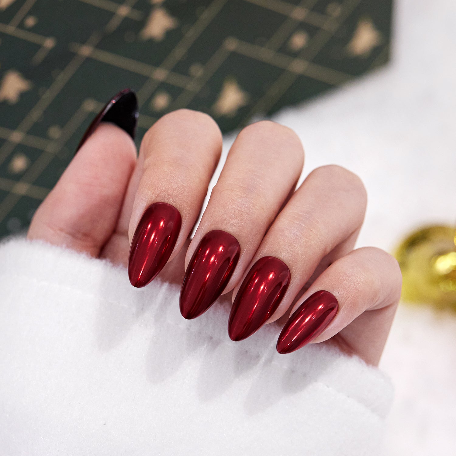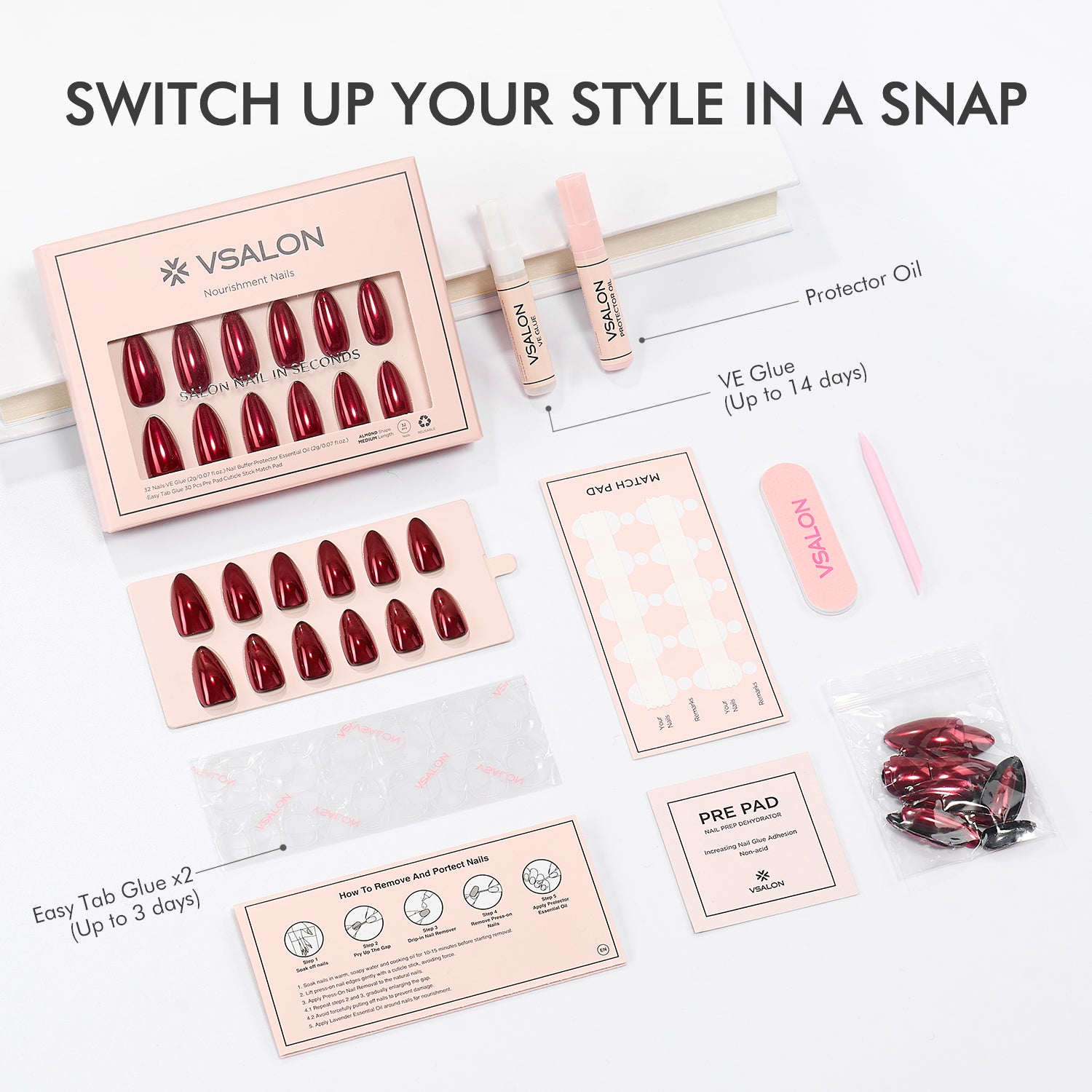 VSALON Nourishment Nails “Bourgogne Glide” Red Short Almond Press On Nails – model wearing.