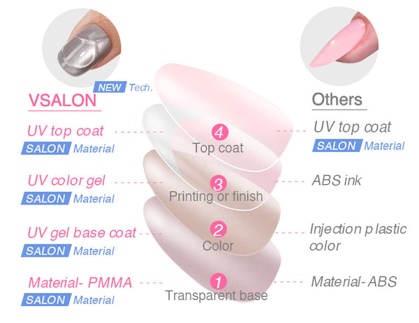 VSALON is a brand-new idea after testing and researching user's complaints of all existing press-on nail products in the market. Some historical brands insist to offer economical solutions to nail lovers while some emerging brand prefer to offer seasonal or thematic looks to those who shifts nails from time to time. VSALON defines none of these as its value. We decided to borrow the knowledge on females' pursue on daily jewelry wearing. Based on the founders's expertises and resource in jewelry industry and heavy investments on NEW MATERIALS, e.g. VPMMA, new formula, e.g. UV cure glue, and new craftsmanships e.g. V-Taper & V-CURVE.