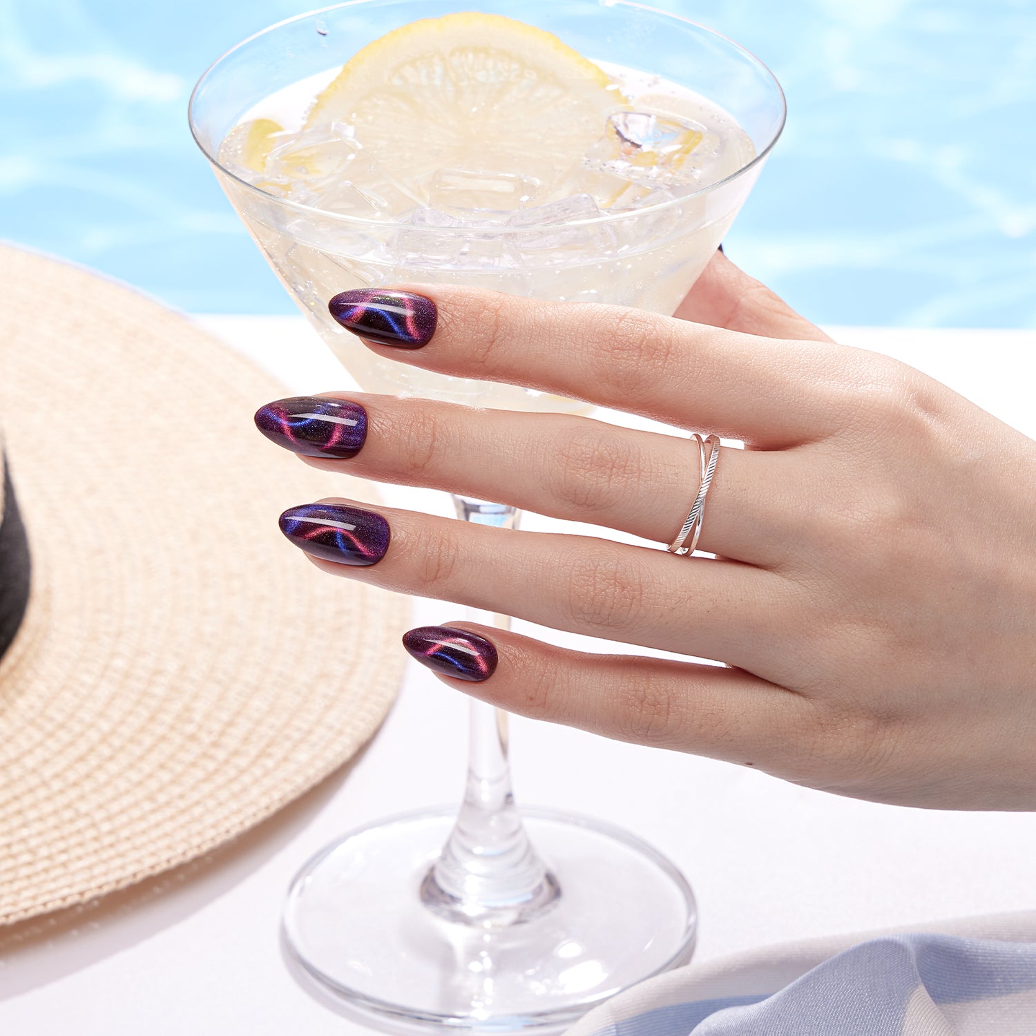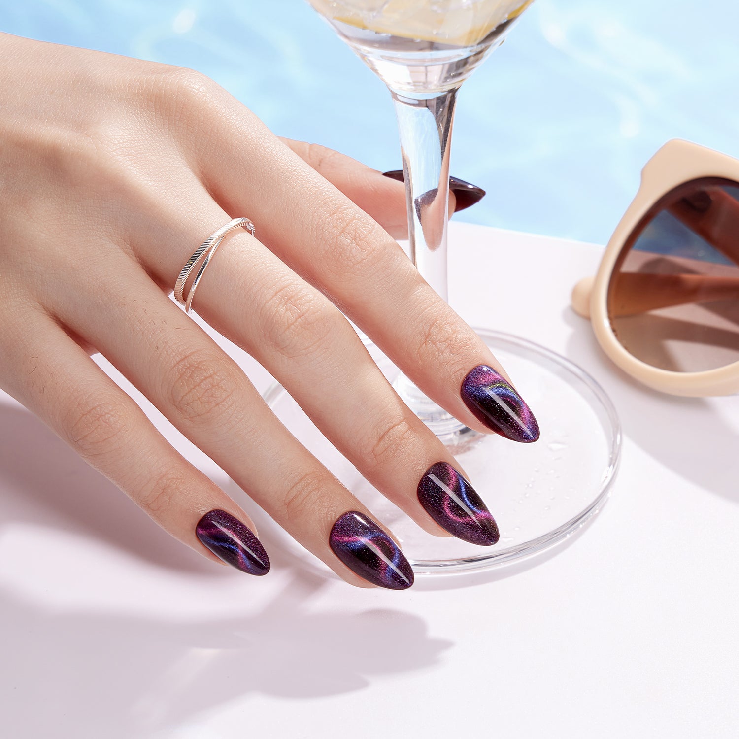 Aurora Cat Eye – Featuring a brown base layered with four silky cat-eye effects in pink, purple, blue, and yellow, these press-on nails shift colors under different light angles for a dazzling, multi-dimensional look. A true showstopper, perfect for everyday elegance or as a stunning gift for girls and women.