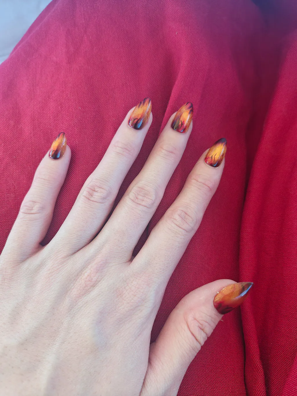 Molten Amber Flames – Featuring a golden brown cat-eye base with fluid flame-inspired swirls, these press-on nails create a warm, molten texture. Bold yet elegant, they add a refined fiery charm to everyday outfits or special occasions.