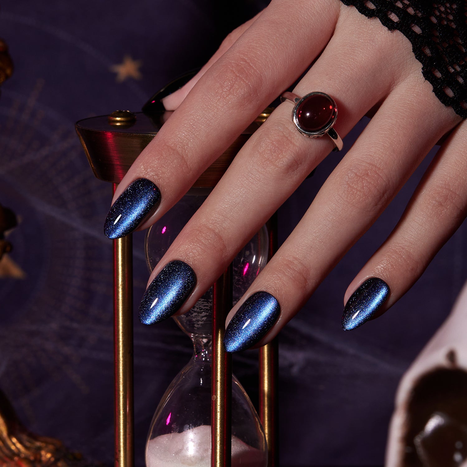 New Salon UV Gel Press on Nails - Starry Blue Cat Eye| 32 Nails in 16 Sizes, 2 Glues