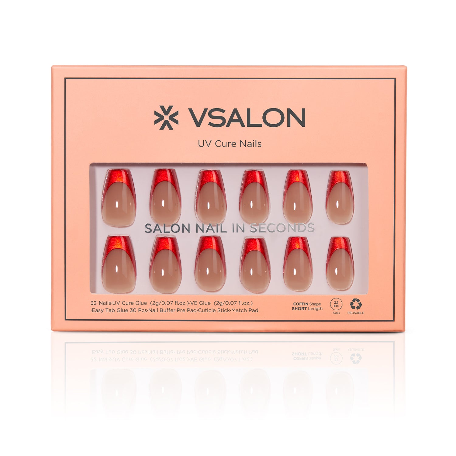 Crafted with 100% salon-grade UV gel, VSALON press-on nails deliver a glossy, professional finish that feels fresh from the salon. Enjoy a strong hold of up to 14 days with glue or a flexible 3-day wear with easy tabs—perfect for your weekly style refresh. Featuring ergonomic tapered edges, each nail blends seamlessly with your natural nail for a secure, bubble-free fit. Every set includes cuticle oil and essential tools to keep your nails healthy, hydrated, and protected.