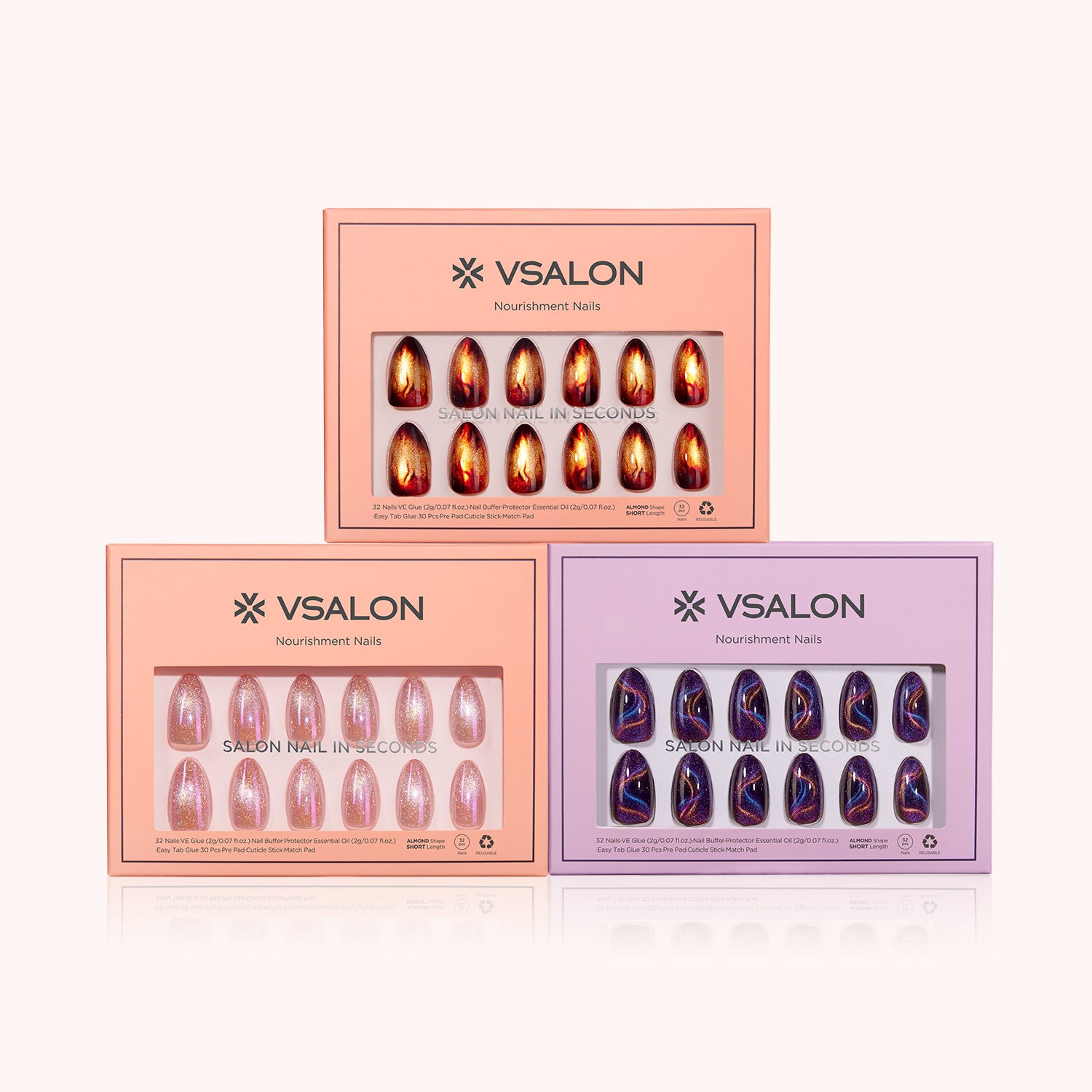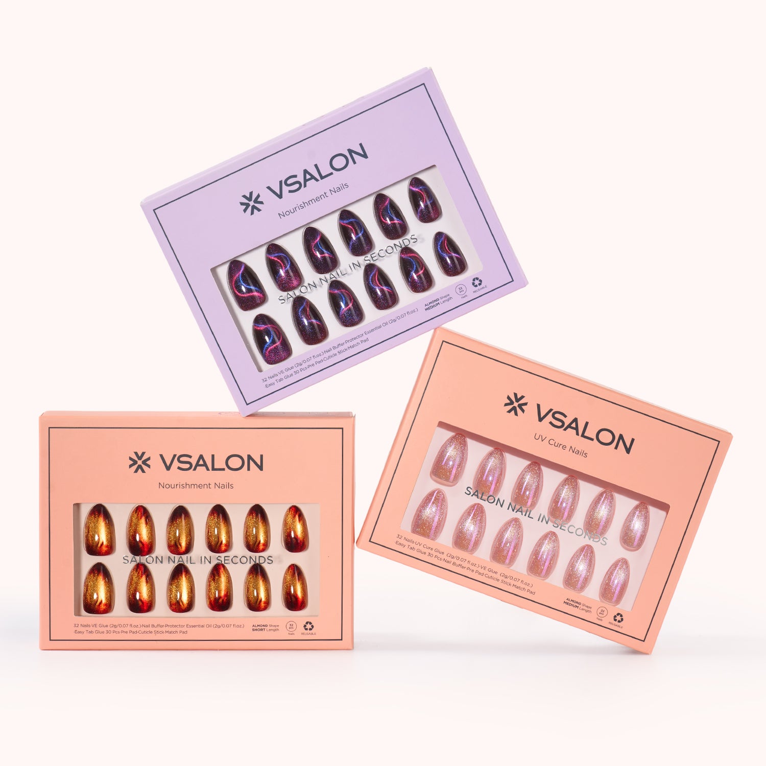 Crafted from 100% salon-grade UV gel, VSALON press-on nails deliver a high-gloss, professional finish that looks fresh from the salon. Designed for quick application and long-lasting wear, each set offers a strong up-to-14-day hold with glue or a flexible 3-day wear with easy tabs—perfect for weekly style updates. With ergonomic tapered edges, the nails fit comfortably and blend seamlessly with your natural nails for a secure, bubble-free, and damage-free experience. Every set also includes cuticle oil and essential tools, keeping your nails healthy, hydrated, and protected.
