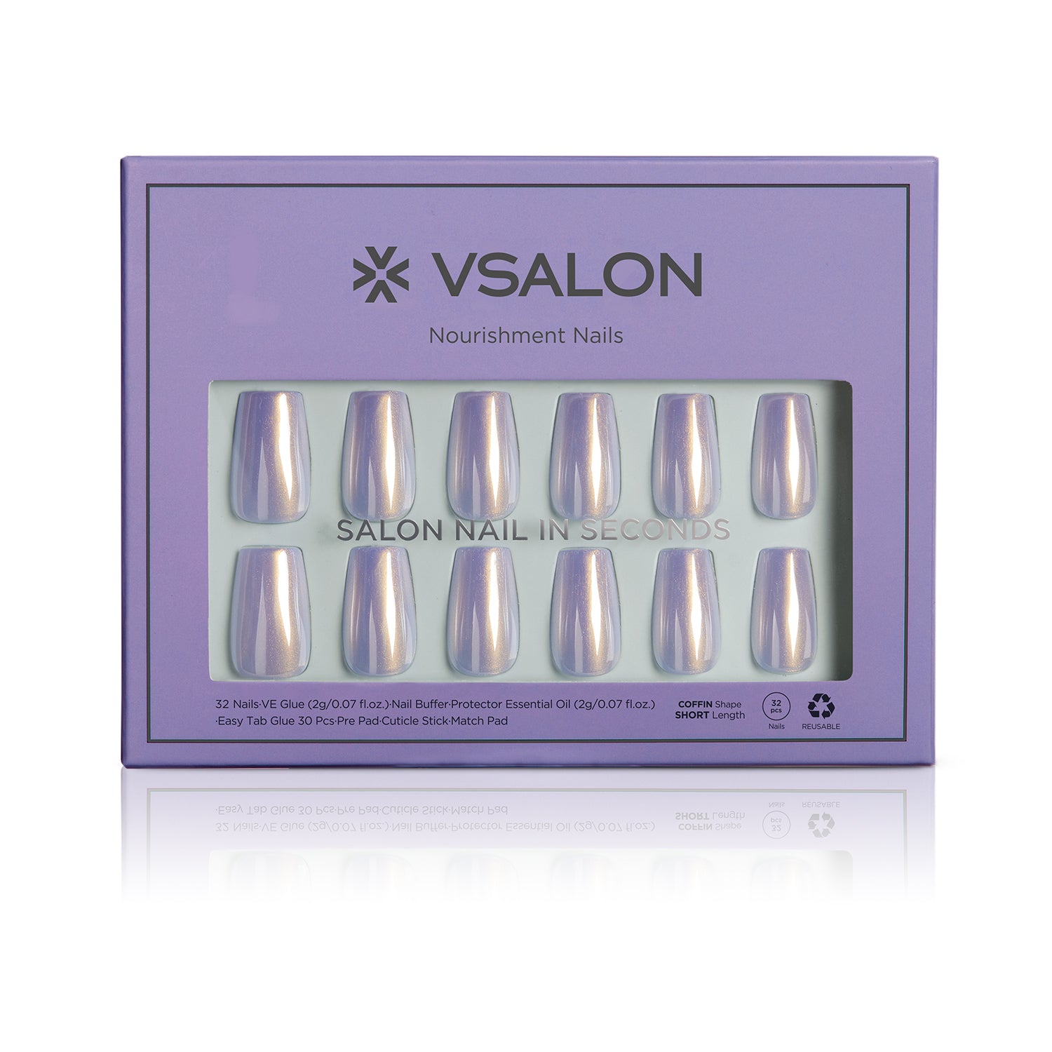 Crafted with 100% salon-grade UV gel, VSALON press-on nails deliver a glossy, professional finish that feels fresh from the salon. Enjoy a strong hold of up to 14 days with glue or a flexible 3-day wear with easy tabs—perfect for your weekly style refresh. Featuring ergonomic tapered edges, each nail blends seamlessly with your natural nail for a secure, bubble-free fit. Every set includes cuticle oil and essential tools to keep your nails healthy, hydrated, and protected.