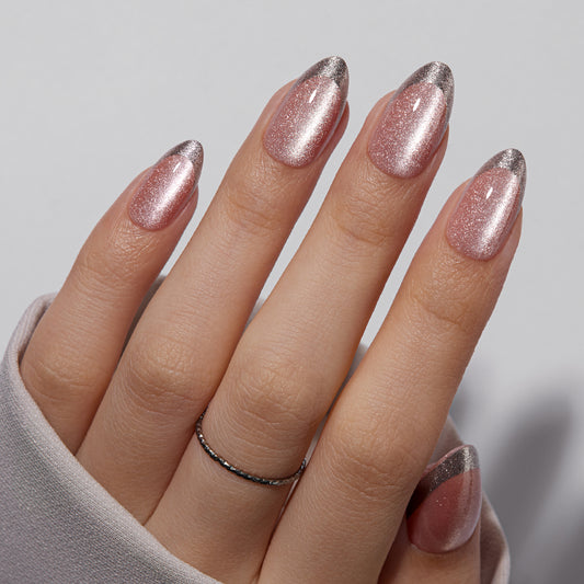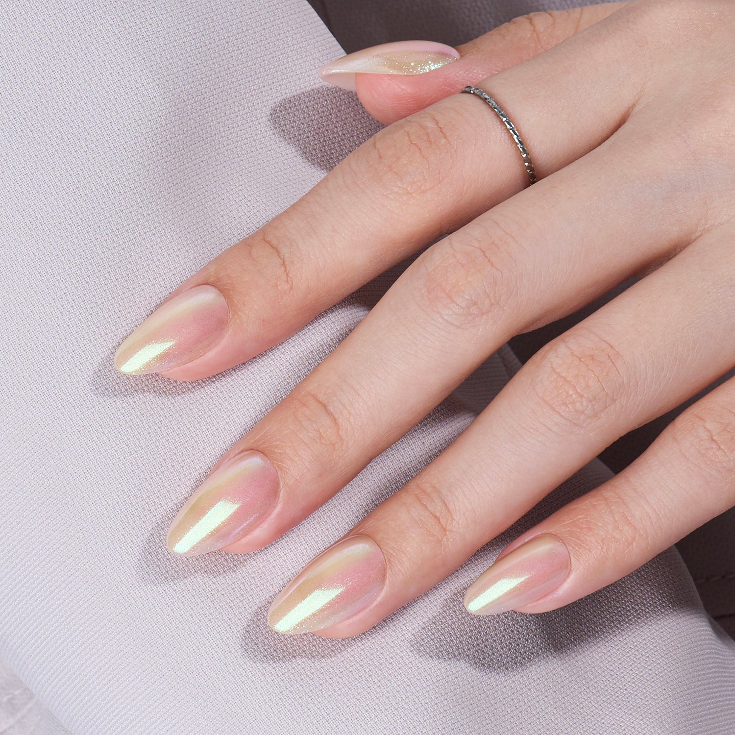 Hologram Gleam Pearl Press On Nails Short Almond | 100% NEW Salon UV Gel Material, Apex Curved Built In Coat, Tapered Edge | 32 pcs in 16 Sizes | UV Cure Glue, VE Glue, Easy Tab Glue