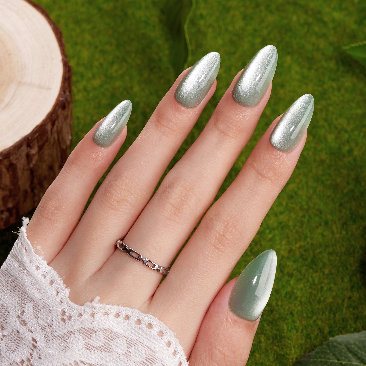 Mint Sparkle Cat Eye – Featuring a delicate mint-green base with a shimmering silver cat-eye effect, these press-on nails bring a fresh, luminous touch to everyday looks. Perfect for adding subtle elegance to daily outfits or as a thoughtful gift.