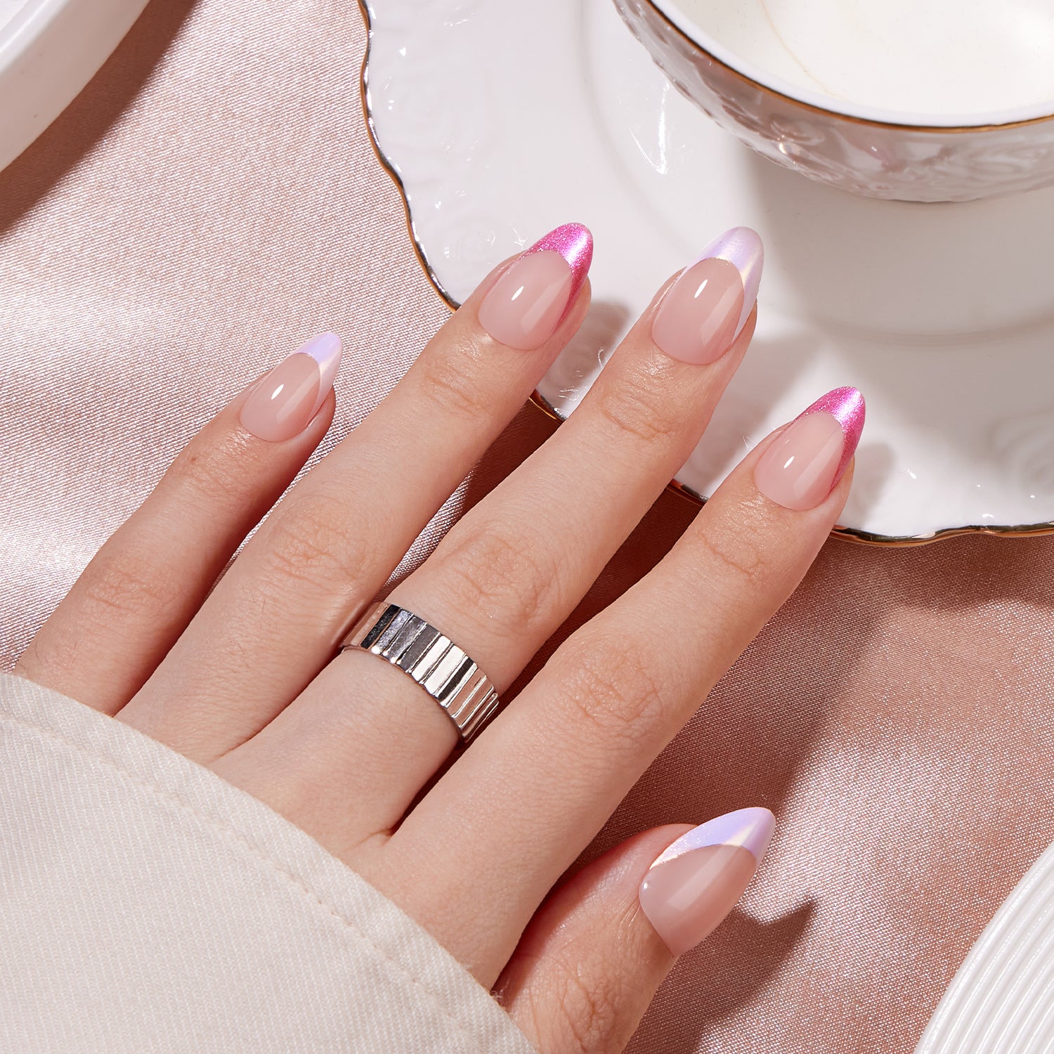 Dual Glittering French Press On Nails - Short Almond Shape|16 Sizes-42 Nails| 3 Glues | Cuticle Oil | Nail Remover | Up to 25+ Days Wear