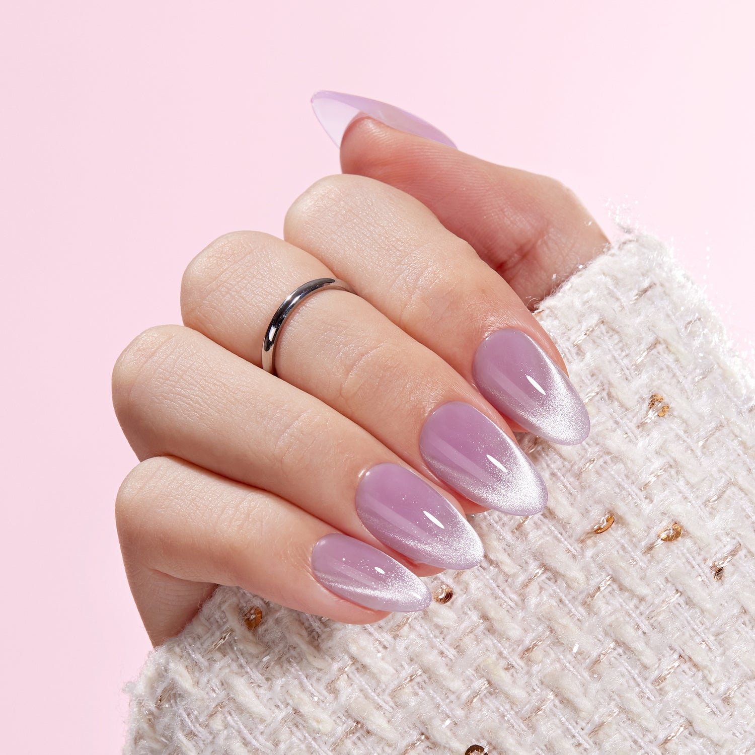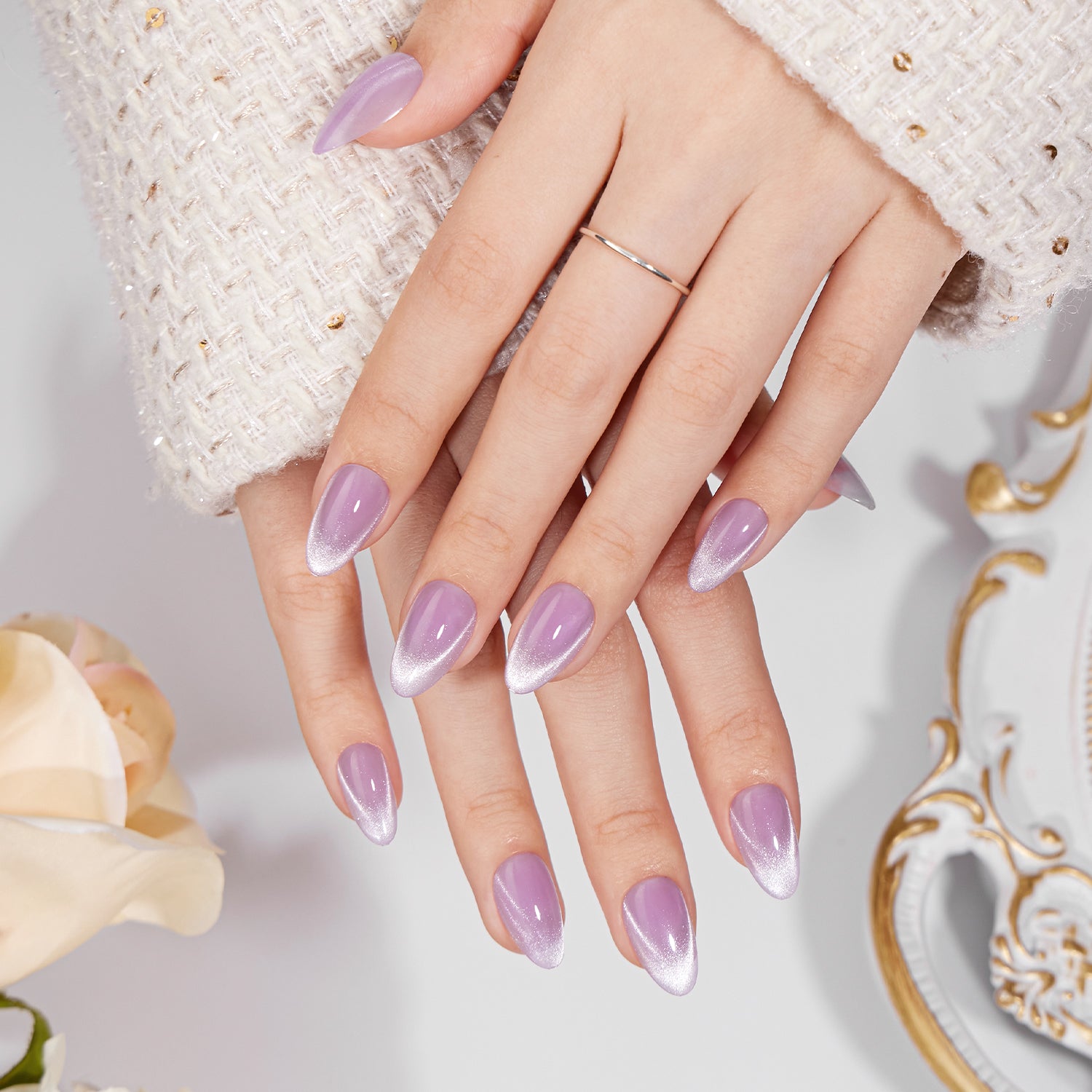 Short Lilac French Tip Cat Eye Glue On Nails Cat Eye Almond Shape|16 Sizes-32 Nails 3Glues