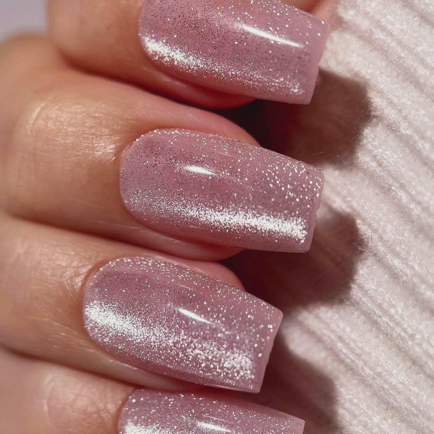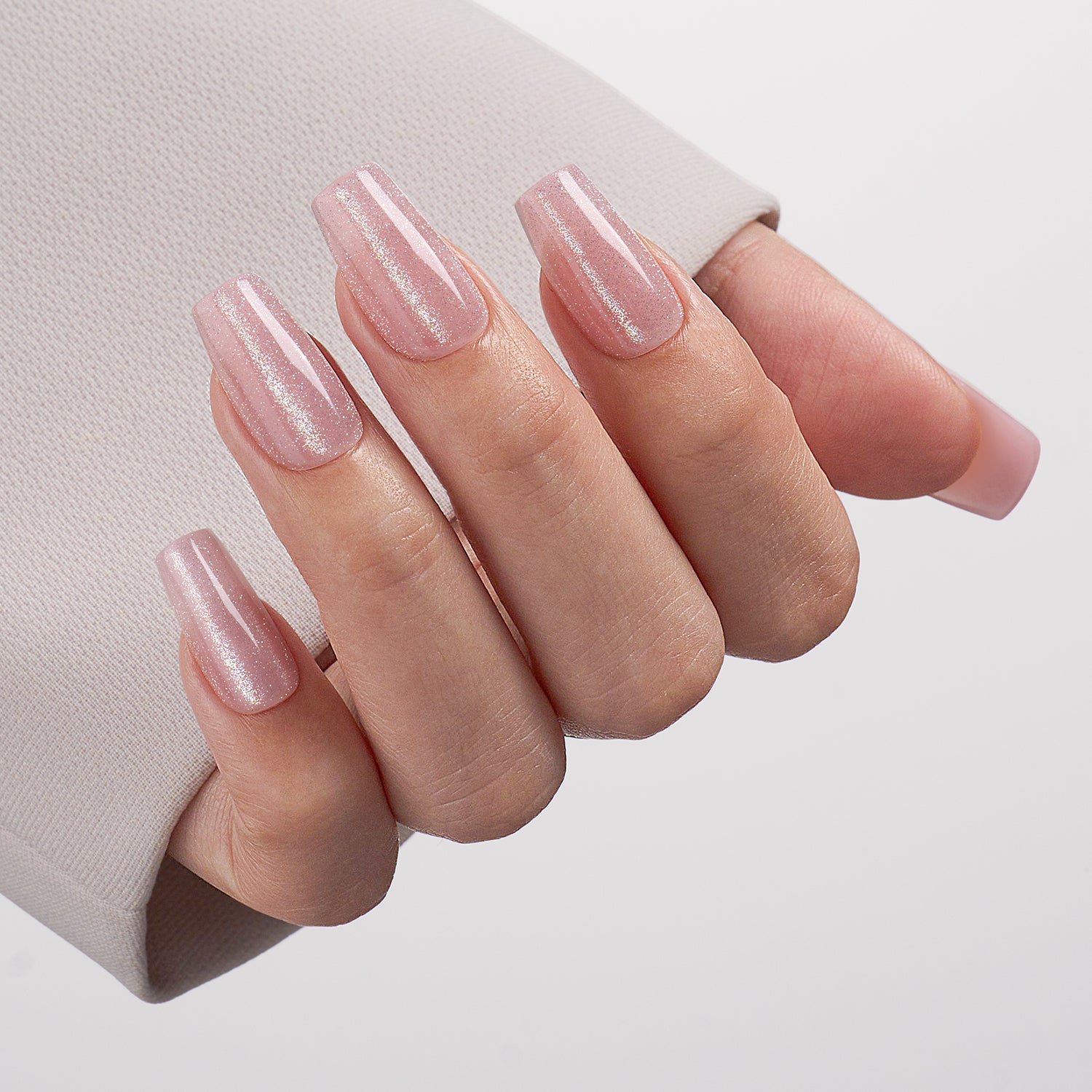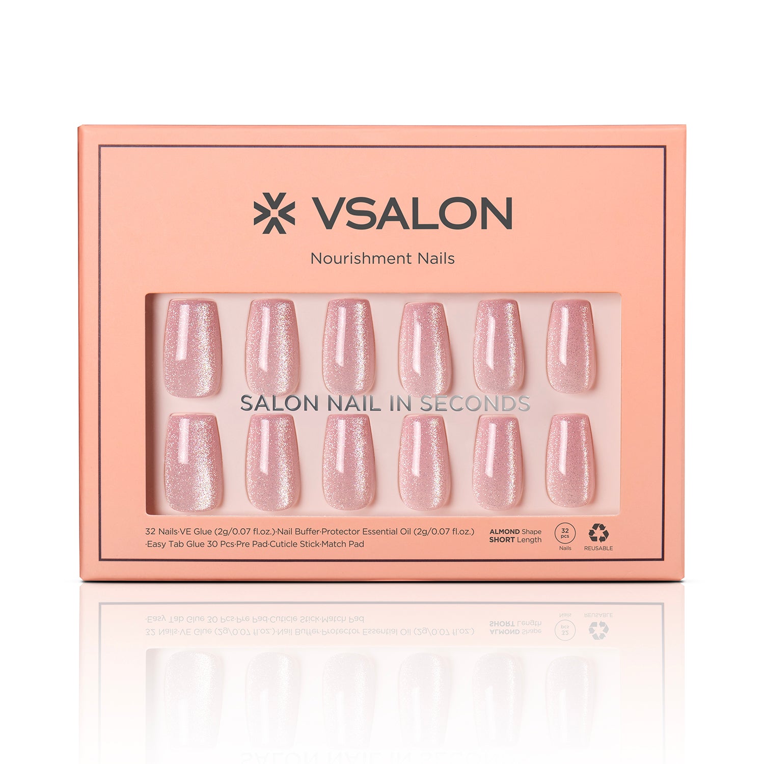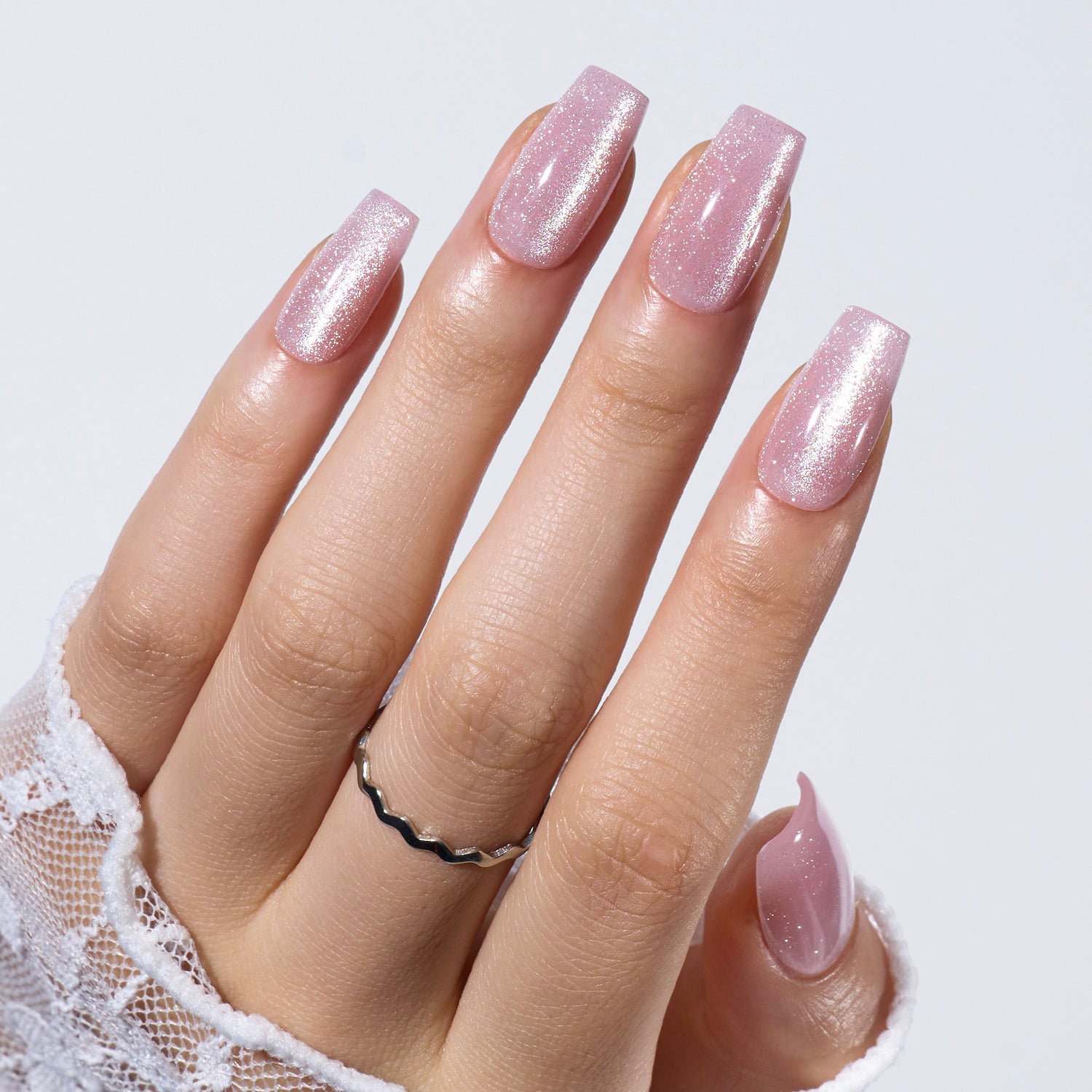 Short Coffin Press On Nails Glittering Pink Cat Eye Finish |16 Sizes-32 Nails 2 Glues, Cuticle Oil