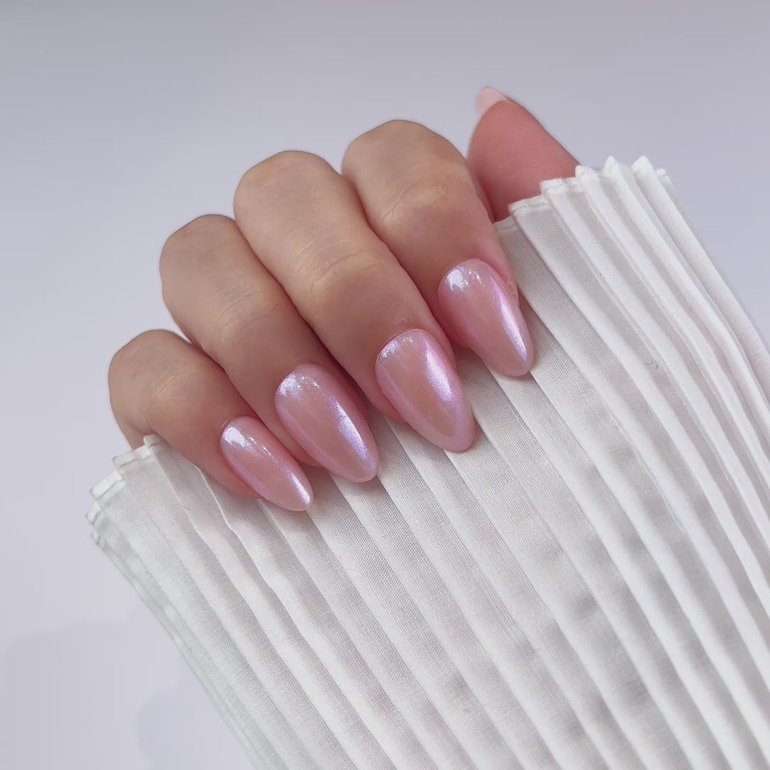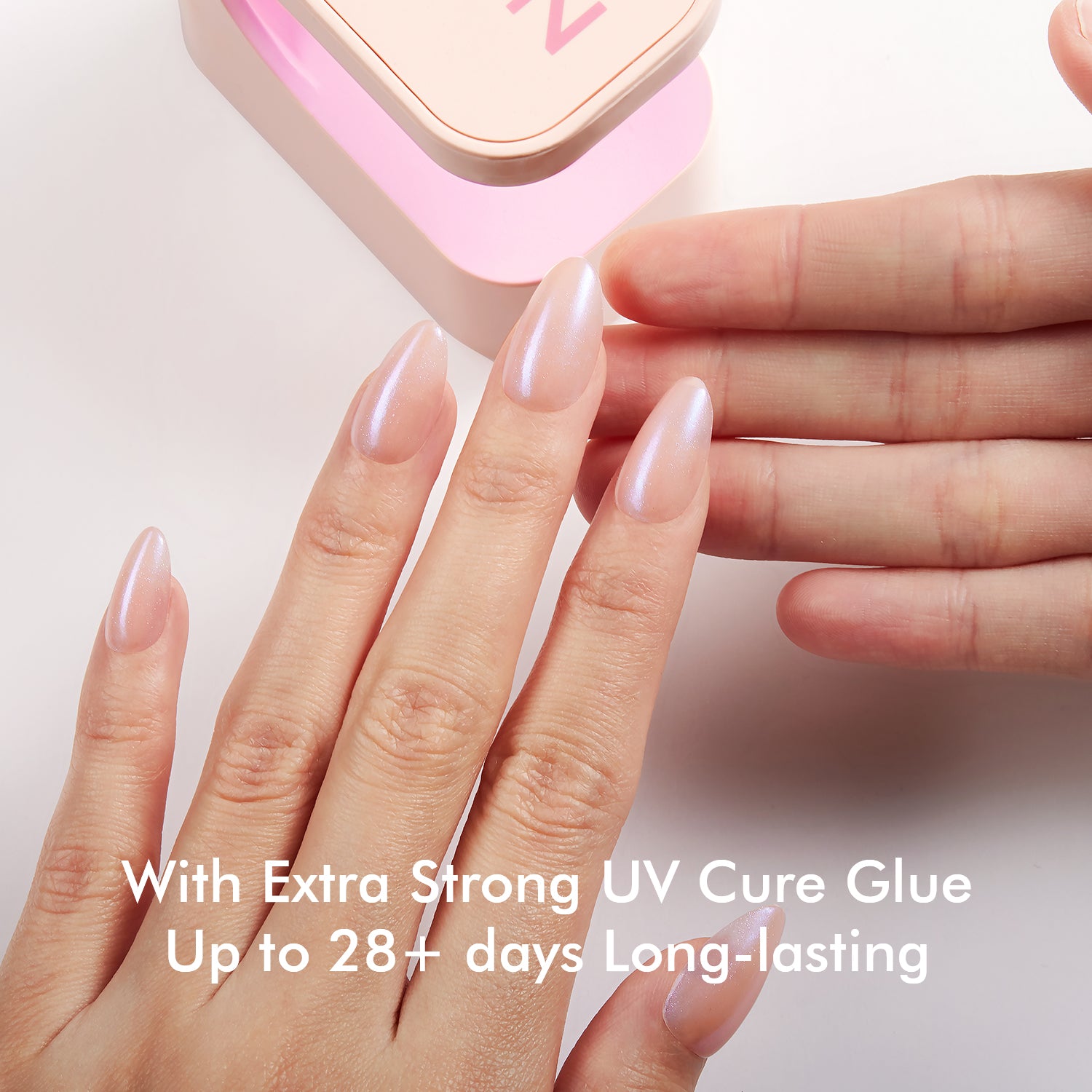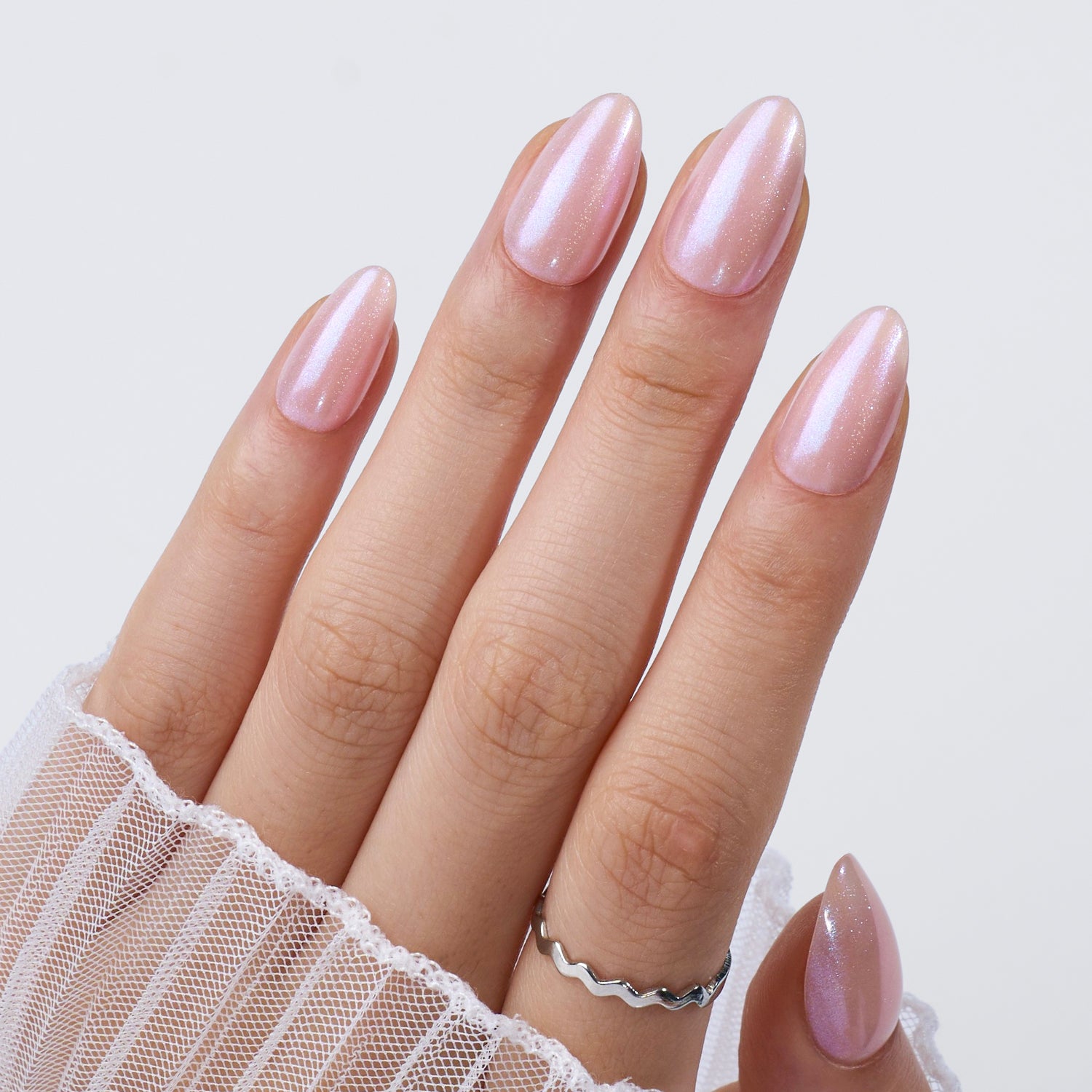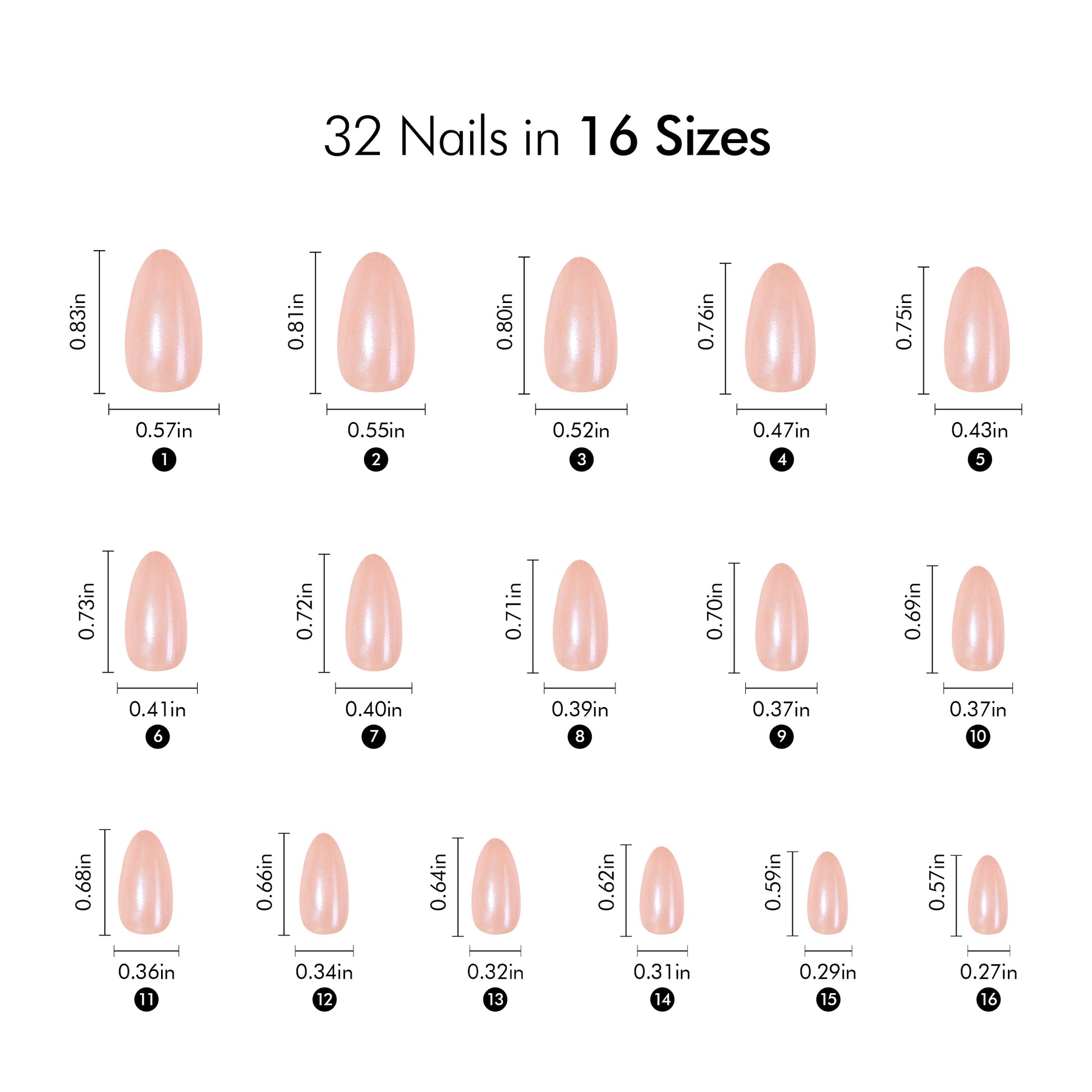 Resuable Pearl Press On Nails Solid Pink Short Almond Shape|16 Sizes-32 Nails, 3 Glues Up to 45 Days Wear