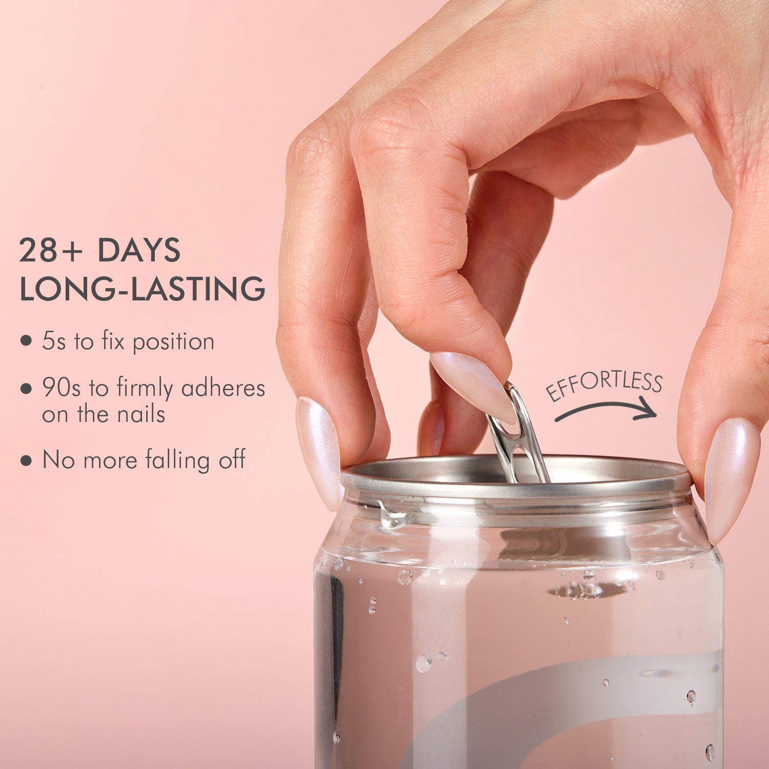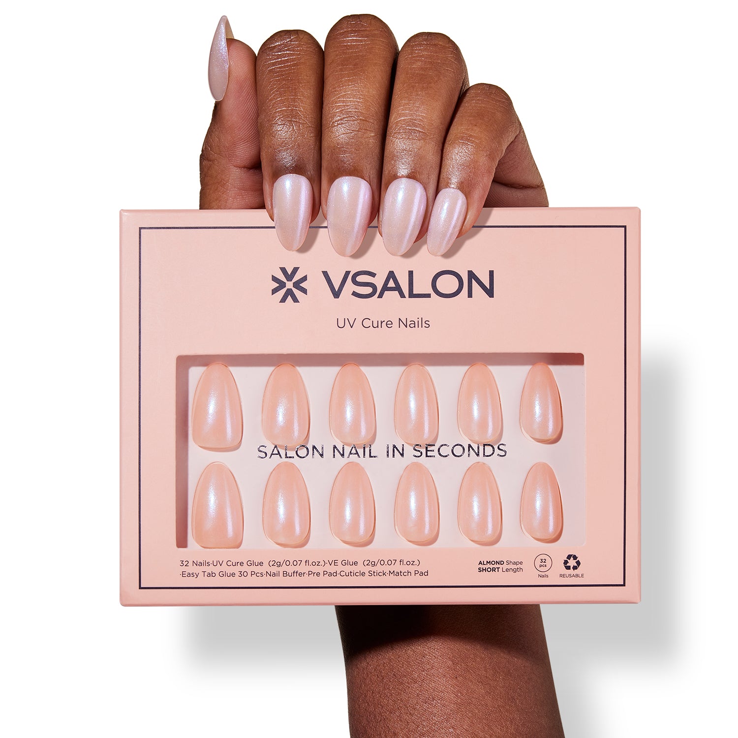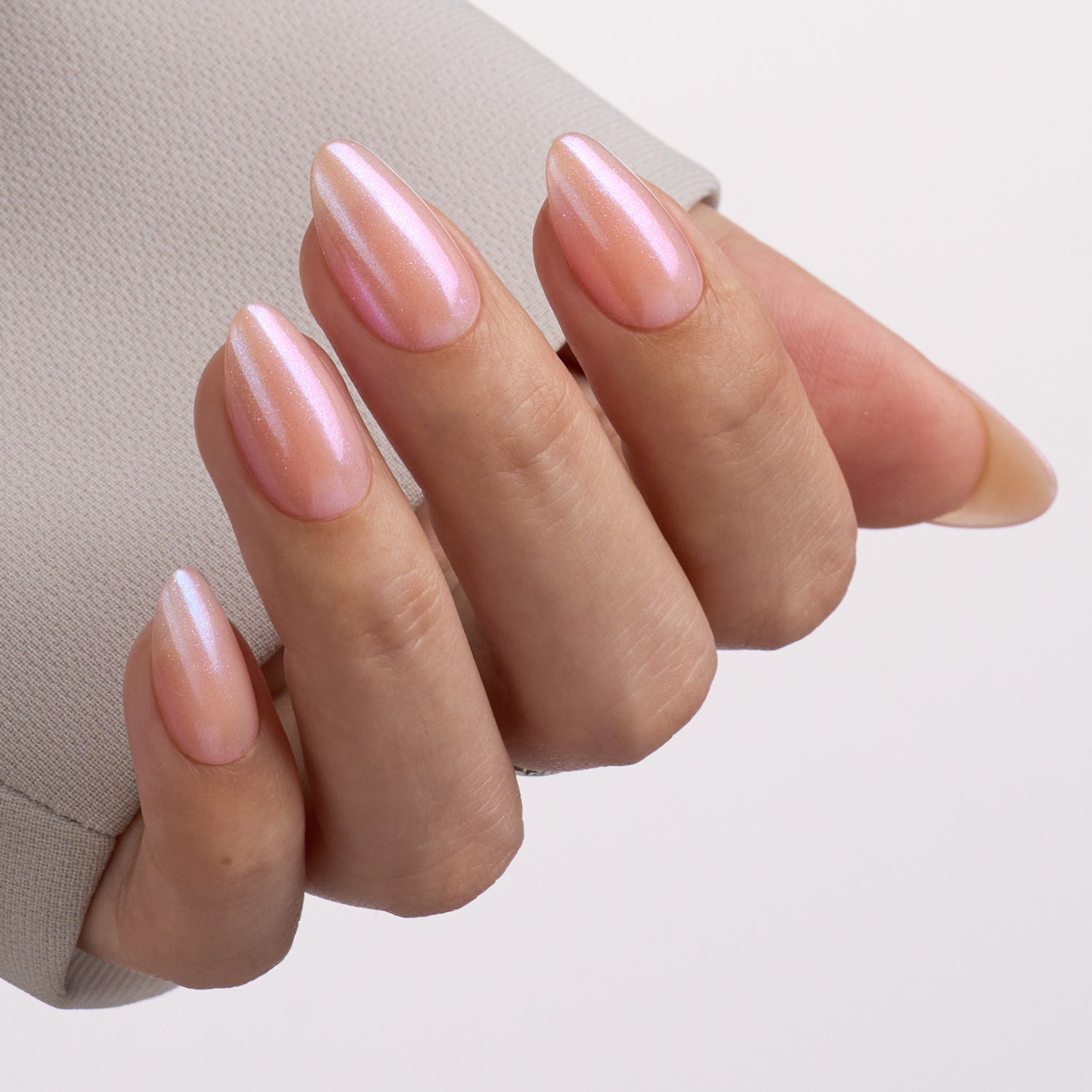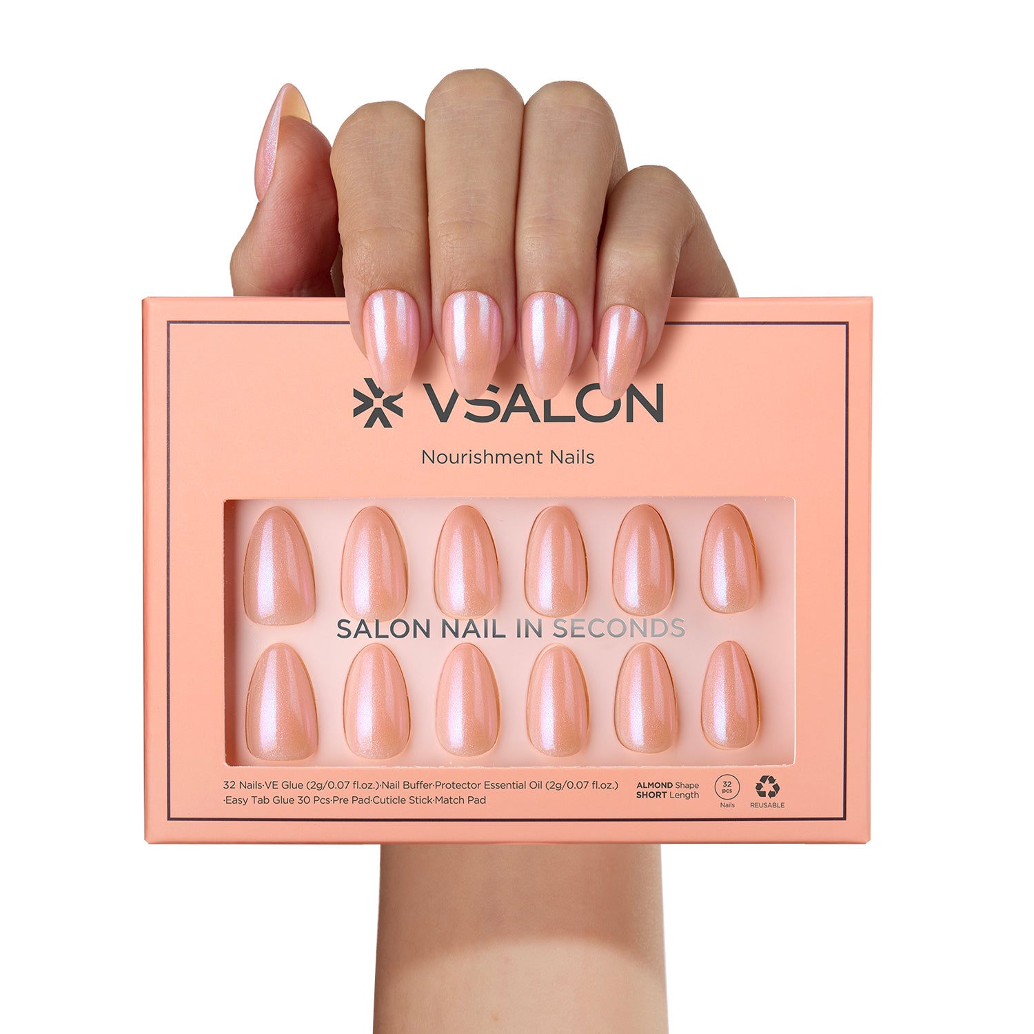 Resuable Pearl Press On Nails Solid Pink Short Almond Shape|16 Sizes-32 Nails, 3 Glues Up to 45 Days Wear