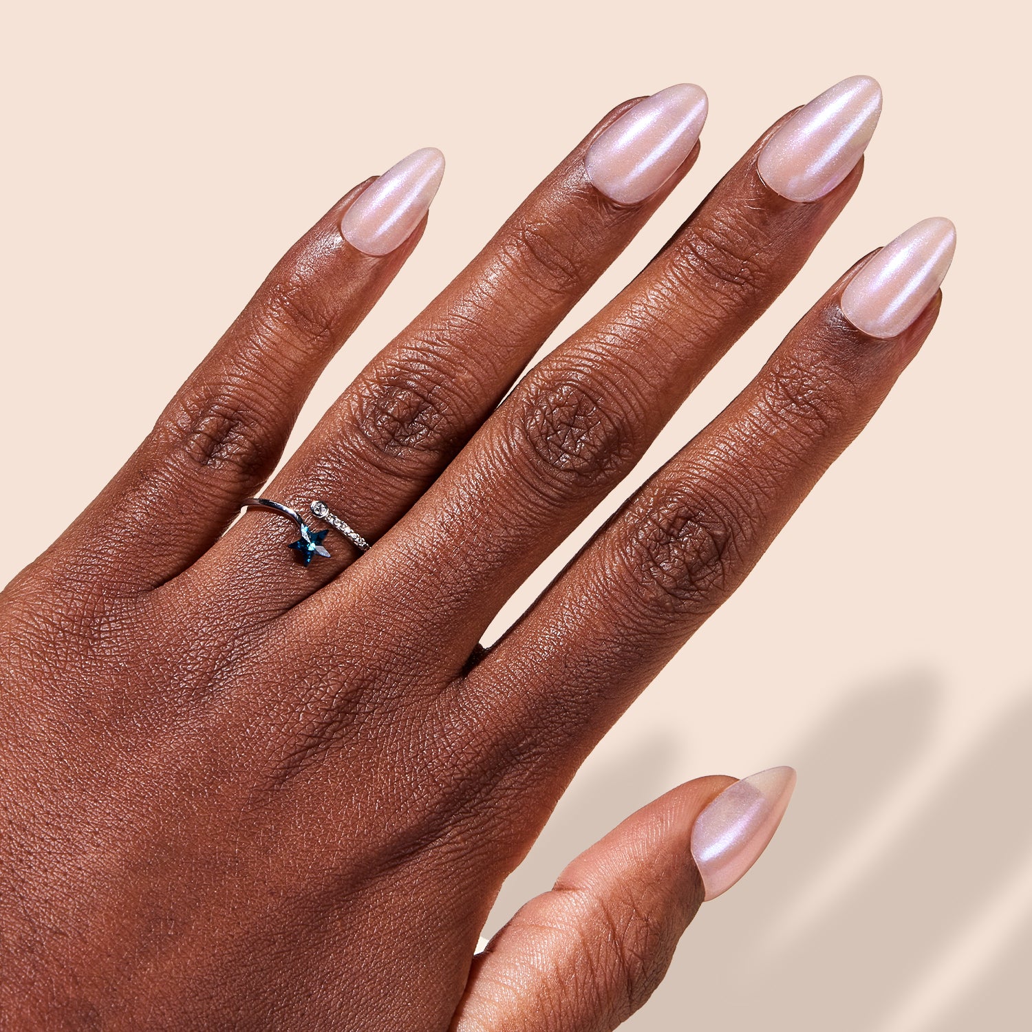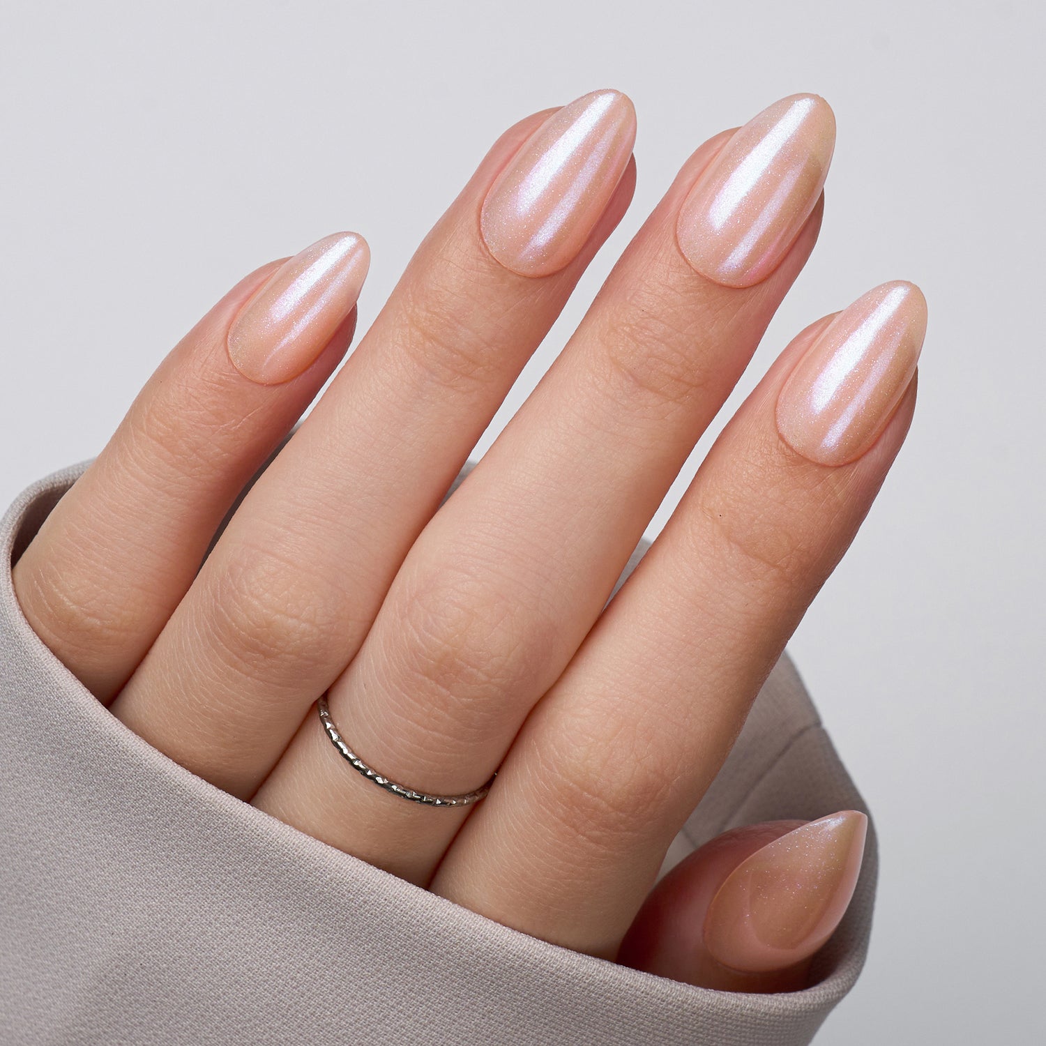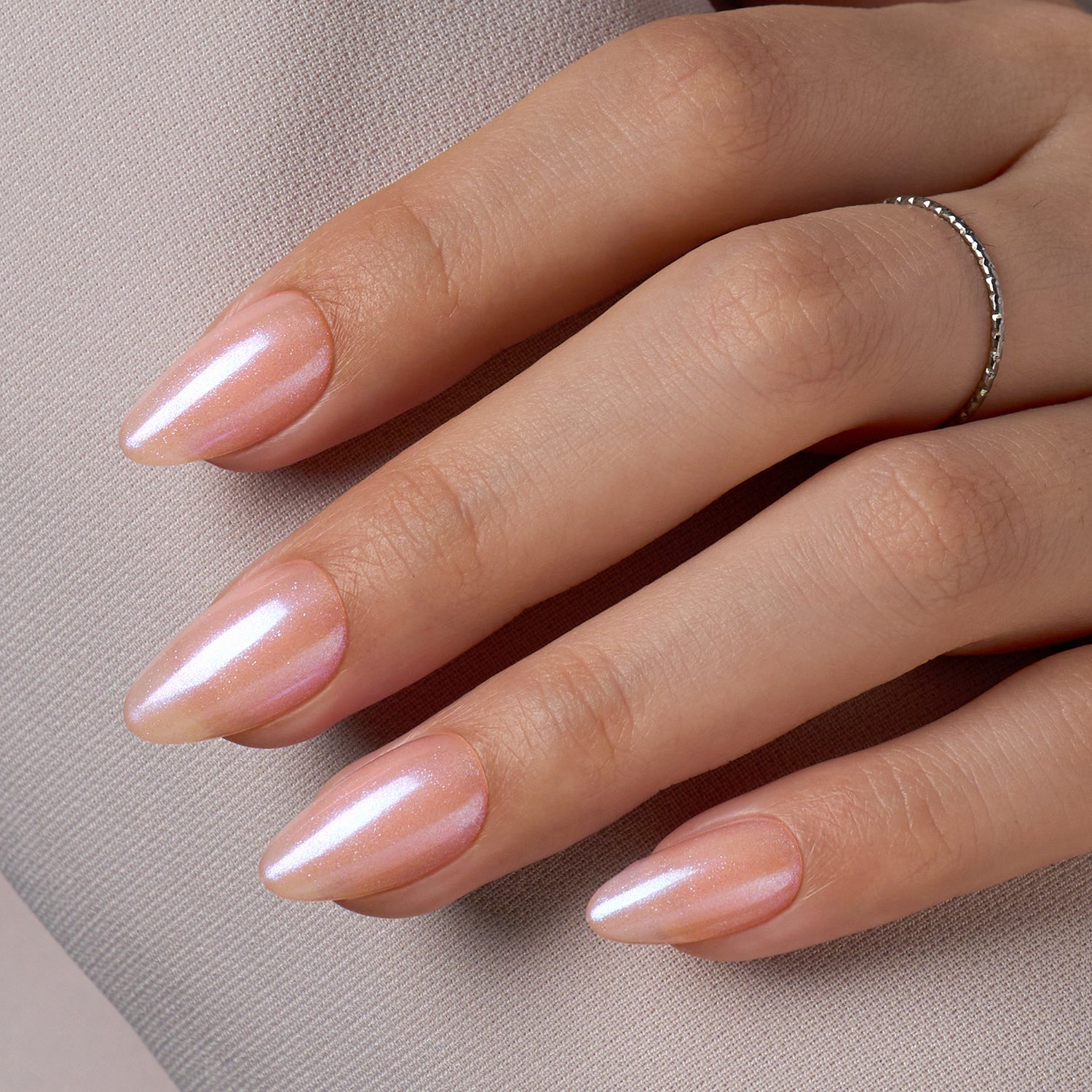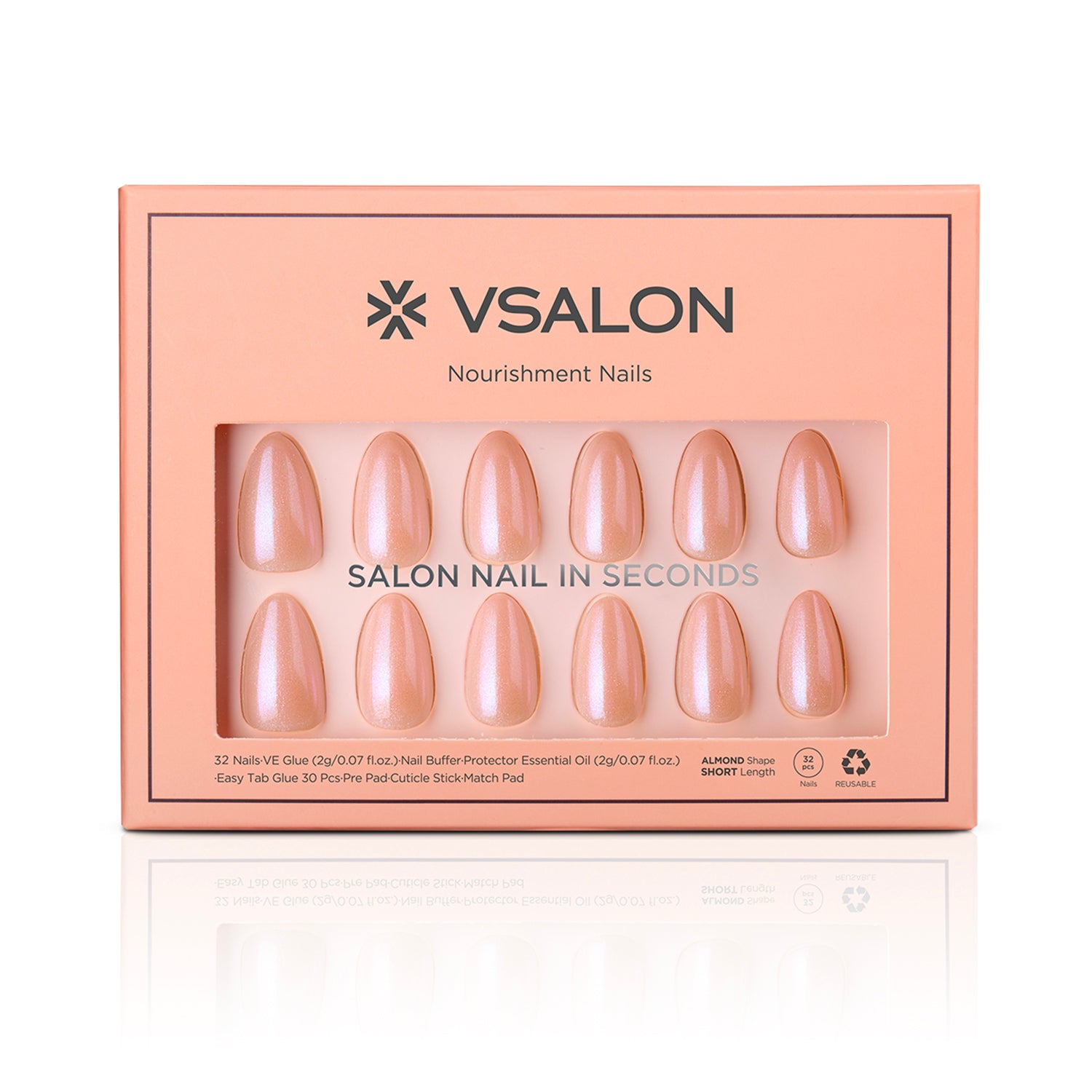 Resuable Pearl Press On Nails Solid Pink Short Almond Shape|16 Sizes-32 Nails, 3 Glues Up to 45 Days Wear