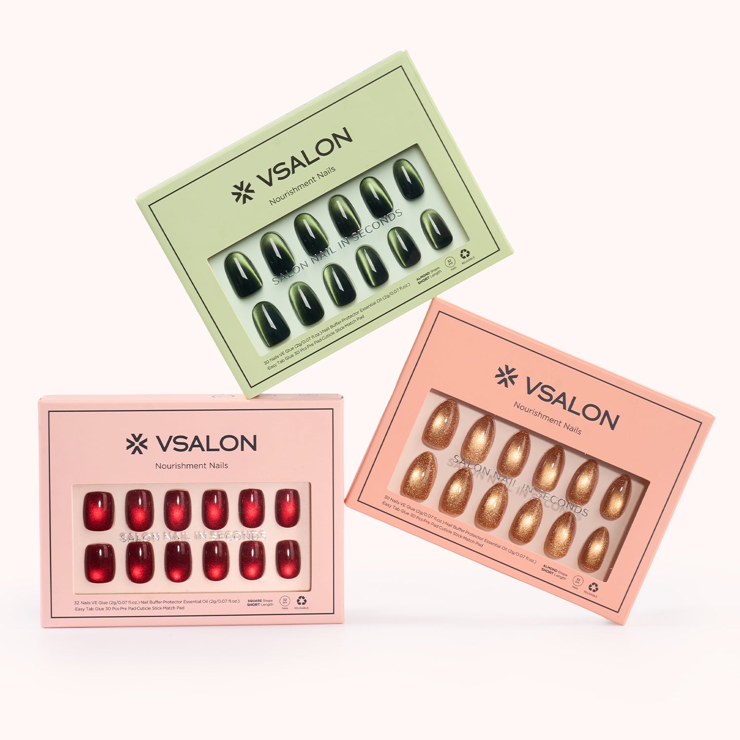 Crafted from 100% salon-grade UV gel, VSALON press-on nails deliver a high-gloss, professional finish that looks fresh from the salon. Designed for quick application and long-lasting wear, each set offers a strong up-to-14-day hold with glue or a flexible 3-day wear with easy tabs—perfect for weekly style updates. With ergonomic tapered edges, the nails fit comfortably and blend seamlessly with your natural nails for a secure, bubble-free, and damage-free experience. Every set also includes cuticle oil and essential tools, keeping your nails healthy, hydrated, and protected.