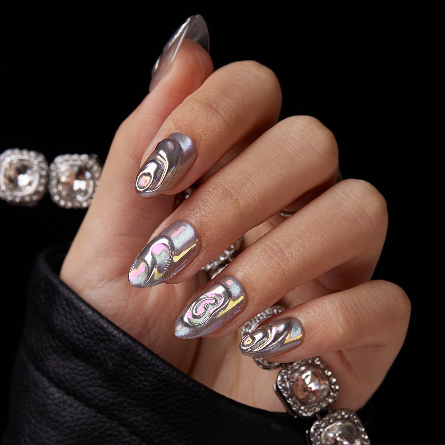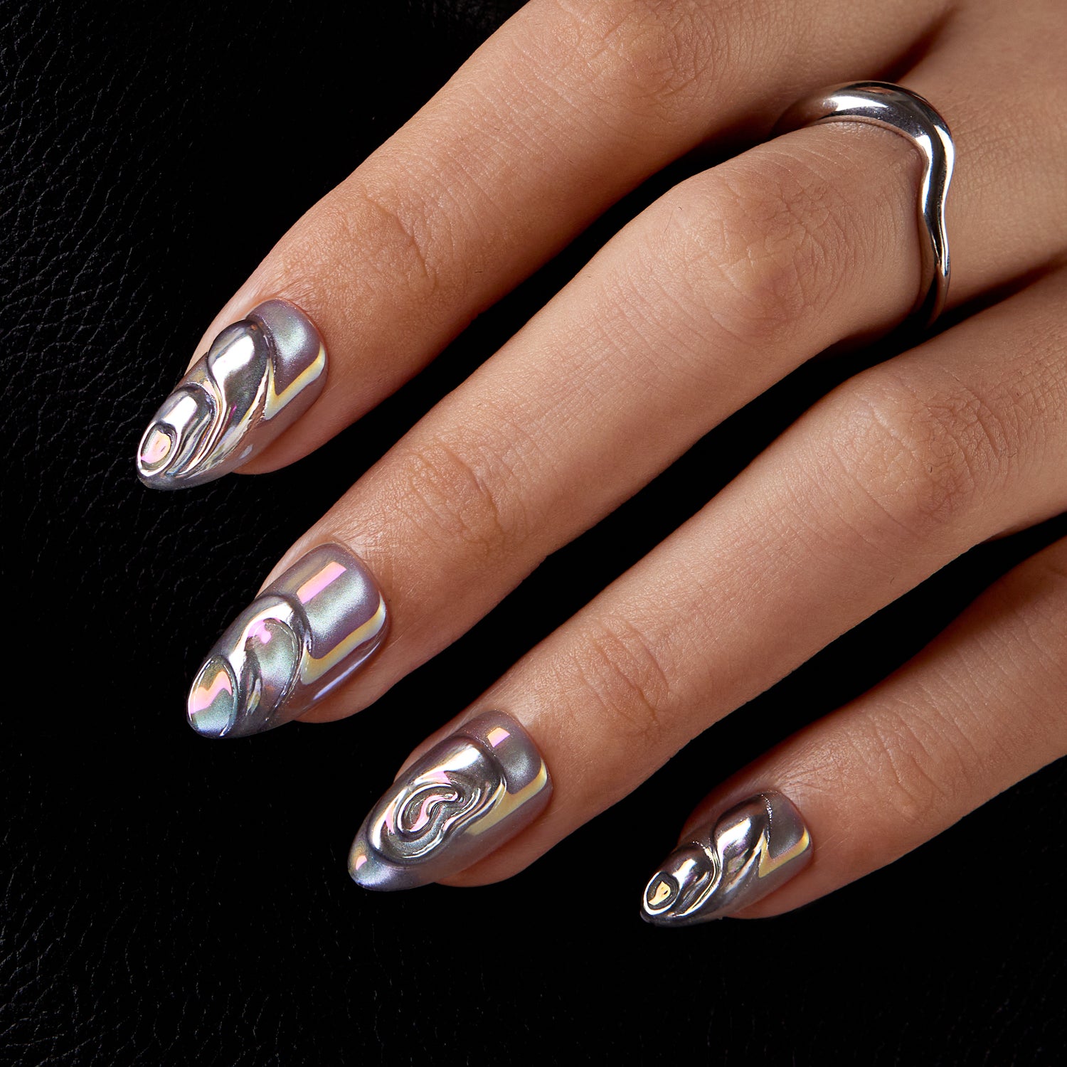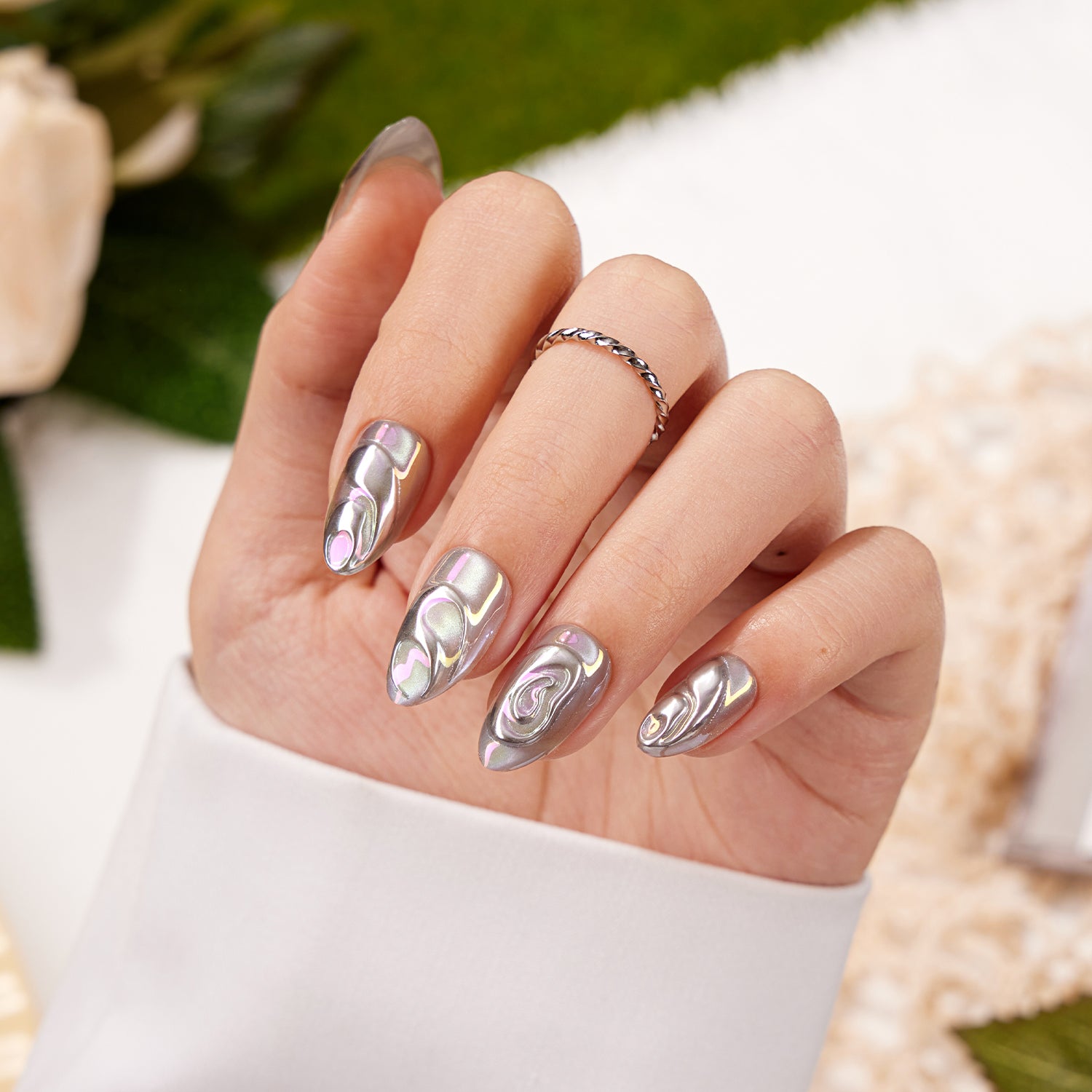 Hologram 3D Metallic Press On Nails in Silver Grey, 100% NEW Salon UV Gel Material | 16 Sizes in 32 Nails, VE Glue, Easy Tab Glue, Cuticle Oil