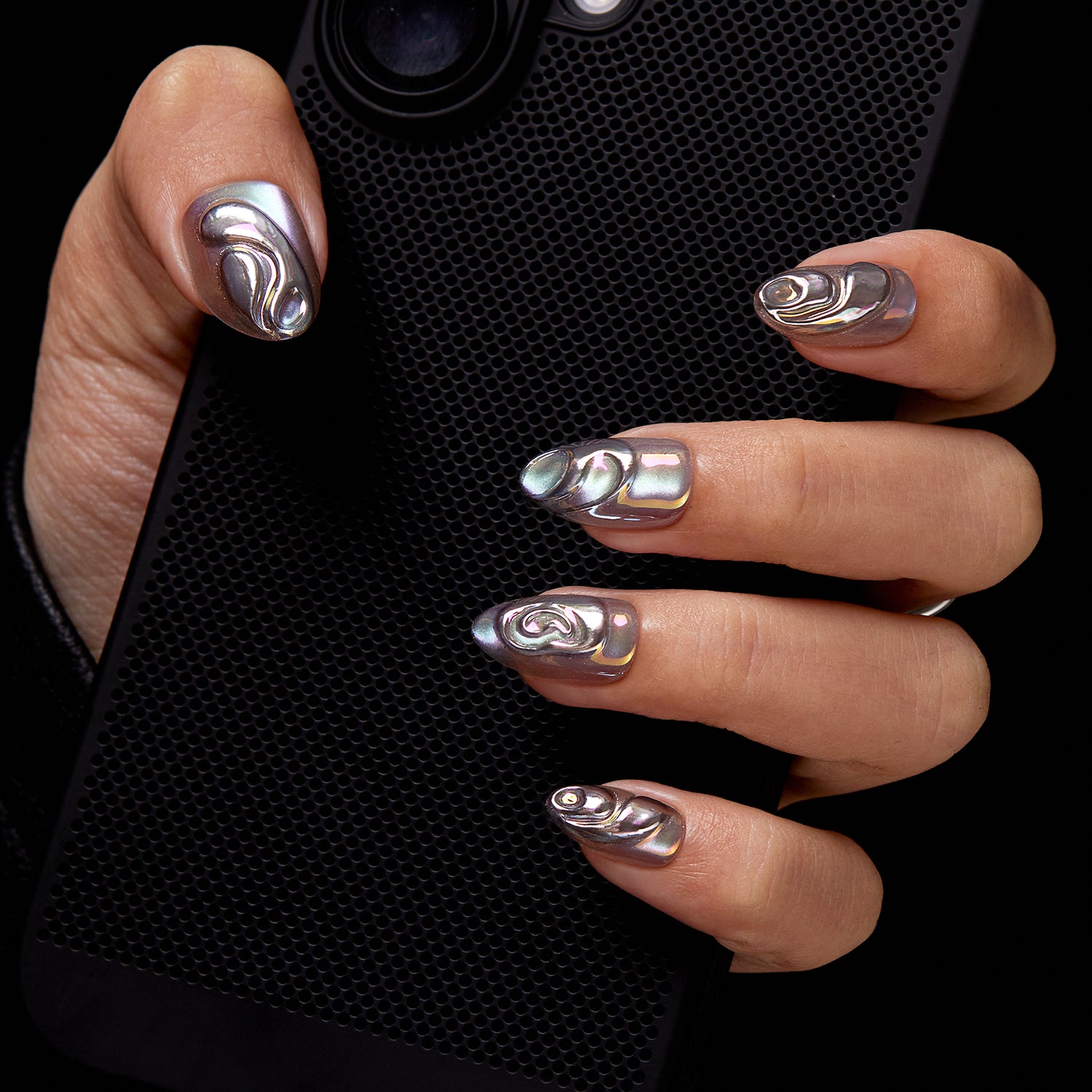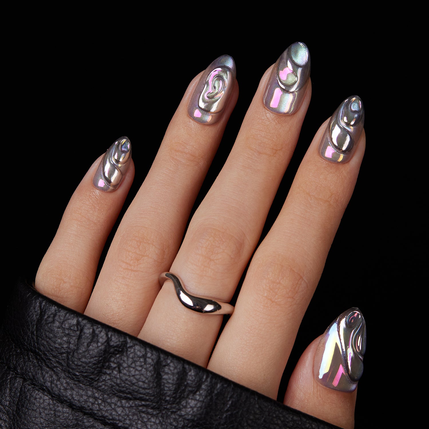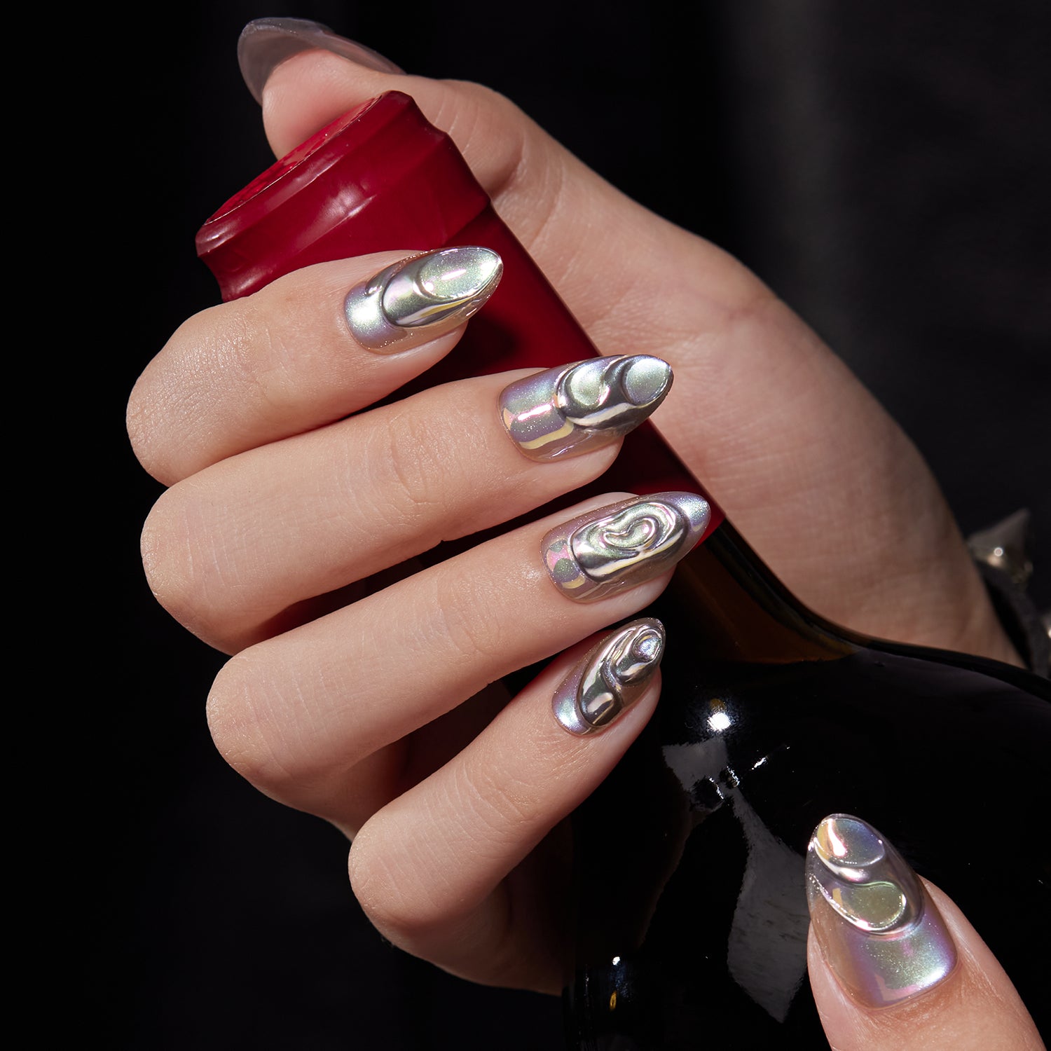 Hologram 3D Metallic Press On Nails in Silver Grey, 100% NEW Salon UV Gel Material | 16 Sizes in 32 Nails, VE Glue, Easy Tab Glue, Cuticle Oil