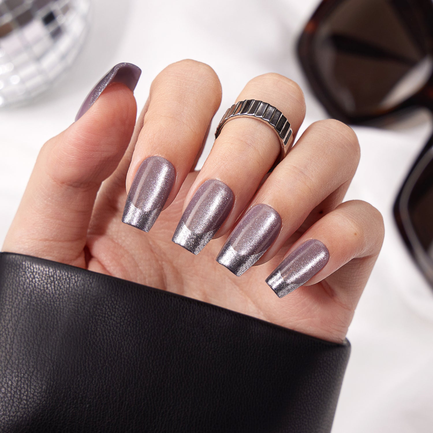 Short Coffin Press On Nails with Silver Glittering French Tip |16 Sizes-32 Nails, 2 Glues Up to 3 Weeks Wear